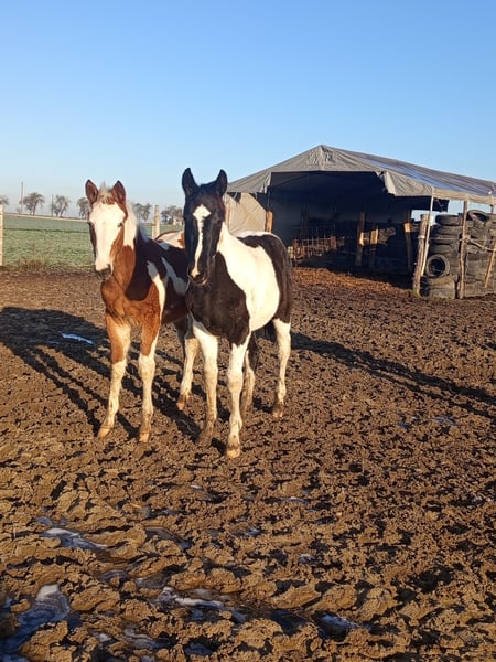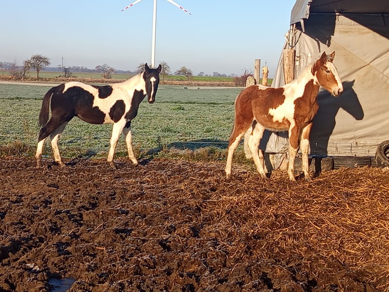 Zu verkaufen: Zwei bunte Junghengste Ich verkaufe zwei scheckige Hengste vom selben Vater (verschiedene Mütter). Geboren im April und Juni. Hengst April: ca. 145 cm Hengst Juni: ca. 138 cm Beide sind gesund, freundlich und wachsen in der Herde auf.