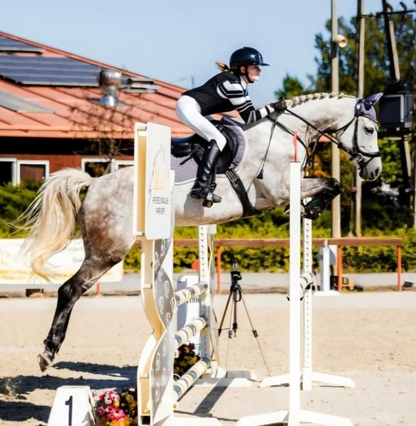 Beautiful eight-year-old frame mare for sport. Suitable for both show jumping and dressage, due to her beautiful movement. Excellent pedigree Number One x O-Bijou de L'ocean / Bijou Be. (166 cm tall) Calm and balanced. Currently in regular sports training, under the care of a physiotherapist and farrier. Currently ridden by a member of the National Children's Team. Current medalist of the Silesian Championships in the Junior category. She has taken the rider from competitions of 80cm to 120cm. Experienced in competition atmosphere, problem-free in transport and during grooming. Goes out on trails, is kept in a paddock. Healthy and never injured. Nice and calm character, eager to learn new things. Ideal for a child starting their adventure with horseback riding or as a first large horse after a pony. Of course, also suitable for an adult. Has an FEI passport, possibility of sale with a new, fitted equipe saddle. More information in a private message. 501 579 729 Welcome, location Częstochowa.