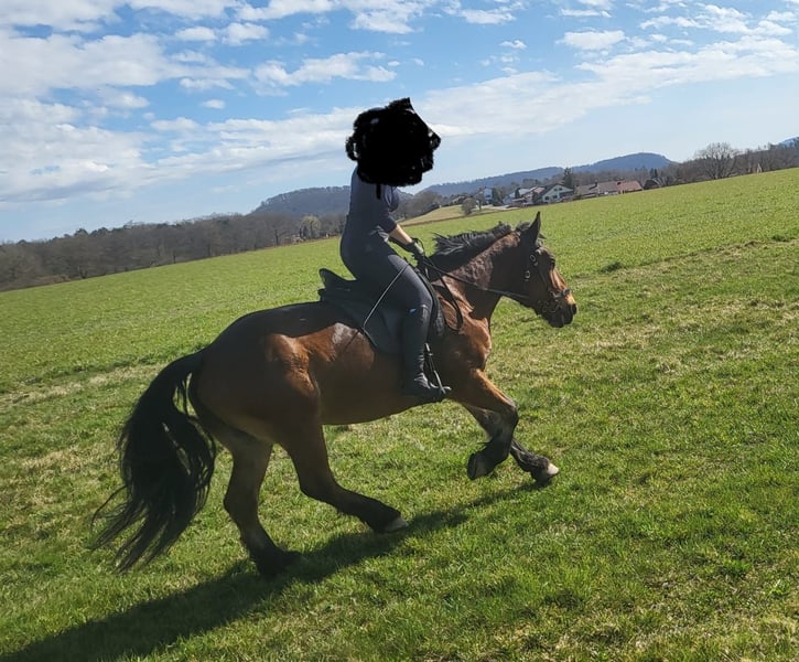 Stute, geritten und einspännig gefahren, Unzüge und Mittelaltershows gegangen. Verkehrssicher, menschenbezogen, liebevoll und dickköpfig. Geht auch beim Reiten allein ins Gelände. Herdenverträglich, kennt Offenstall und Box mit Koppelgang. Sommerekzem, das mit Decke gut zu managen ist. Letztes Jahr akute Arthritis vorne, seither aber mit Beschlag und Gelenknahrung lahmfrei und freizeitmäßig voll reitbar. Abzugeben aus finanziellen und privaten Gründen. Nur an pferdeerfahrene Menschen, die auch fahren (lernen) wollen, denn das macht sie am liebsten. Gerne können Kutsche, Geschirr und Sättel etc. gegen Aufpreis mit erworben werden.