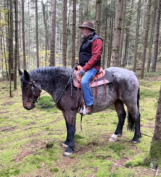 Cold-blooded crossbred gelding, ridden in all three gaits on a bit with water reins. Fearless, very sure-footed, comfortable going through water, traffic, with dogs, farrier, and loading… no problem. Safe electric fence, herd-friendly, loves the stable cat, responds to voice commands, and even fetches his feed bucket. BUT: dislikes groundwork, is reluctant to accept instructions from women and can show his strength! That is the reason for his sale. Our stable girls do not feel comfortable handling him. Therefore, ideally sold to a (male) individual who will give him work and not constantly coddle him. He would make an excellent trekking horse. Absolutely priority over price.