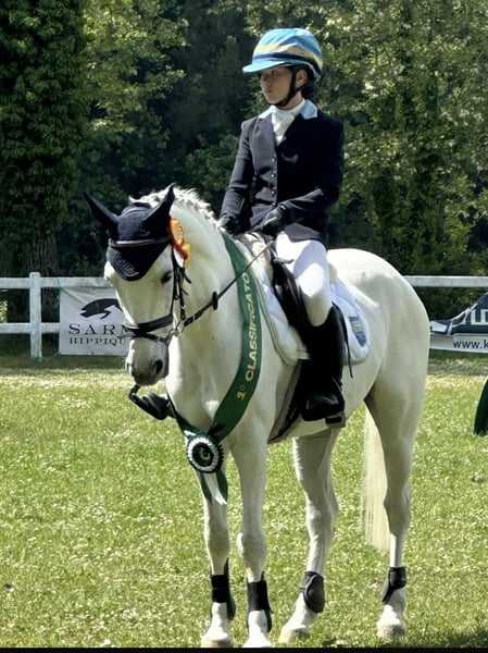 Super primo pony affidabile e senza scortesie. Facile gestione. Freddo e mai scortese. Bravo in gara e a casa. Ottimo nel lavoro in piano , professore per dressage . Esce in passeggiata solo e con altri cavalli. Sale in van senza difficoltà . Facile con maniscalco docciature e tosatura. Bravo per bambini anche piccoli. Mai scortesie in box . Accogliente verso i bambini. Campione nelle 60-80. Vinto campionato regionale CN 60 e tante soddisfazioni in dressage con punteggi alti nelle E avanzate.