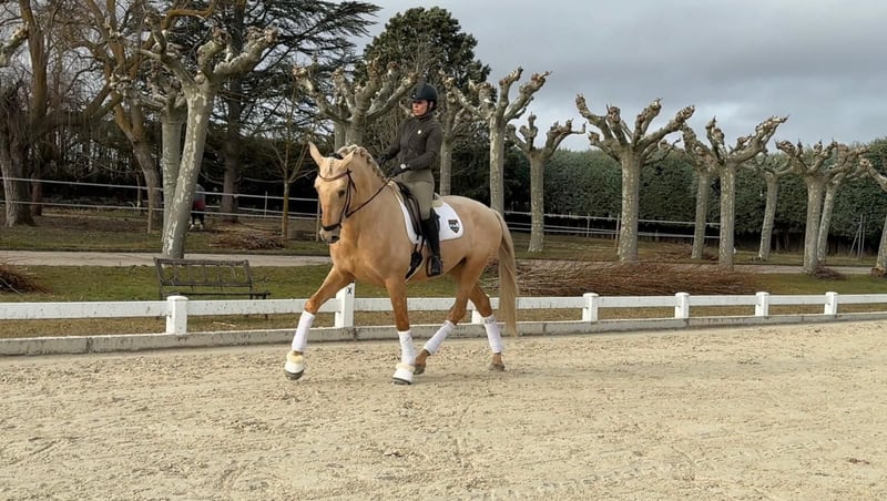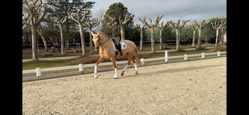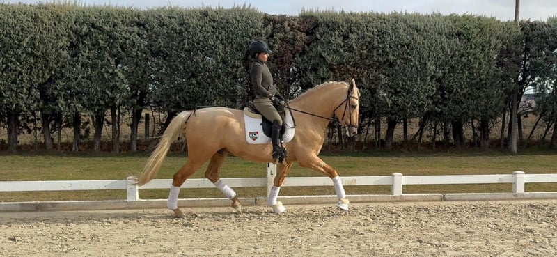 Palomino-Hengst, Sohn des Tiziano III, mit einer Größe von 1,73 m. Im Training für die Dressur, entspricht dem üblichen Niveau seines Alters. Hervorragendes Temperament und äußerst attraktiv im Erscheinungsbild.