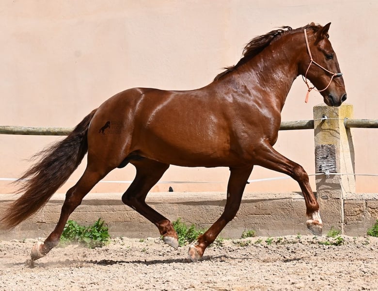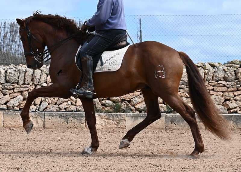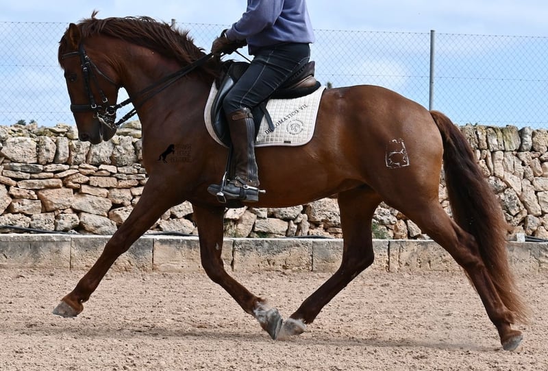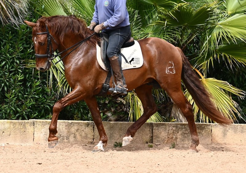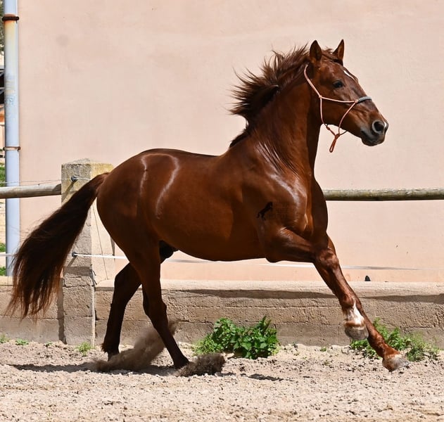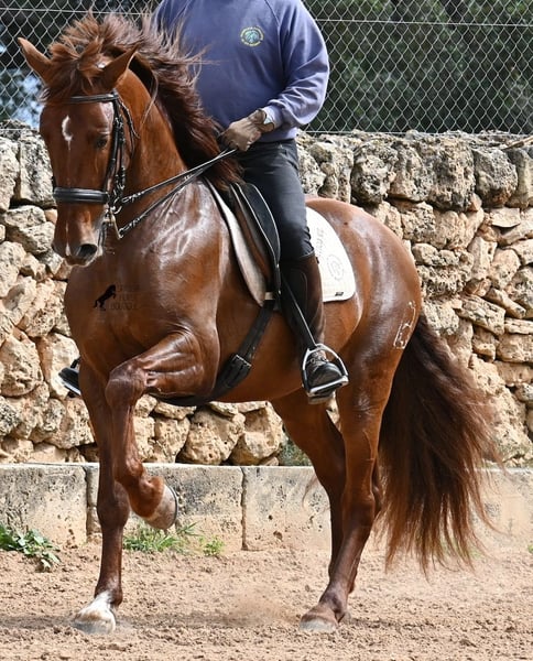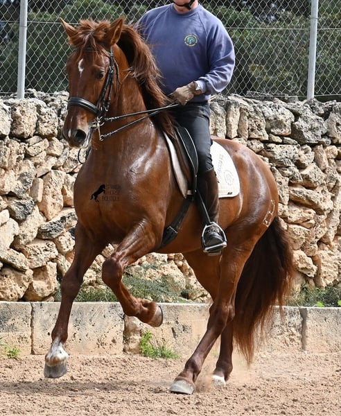 Dieser 2020 geborene PRE Hengst (Andalusier mit Rassenachweis der ANCCE), ist in vielen Aspekten, eine wahre Augenweide! Unumstritten fällt einem als Erstes seine atemberaubende Schöhnheit auf, die der Kupferstich in seinem Fell und der Esprit, nur so verstärken. Doch hinter der schönen Fassade, gibt es einiges mehr zu entdecken. Seine Abstammung ist superior, denn er ist ein Sohn des mehrfachen WELTCHAMPION Fer Bonachon de Eda und somit ein Enkel des berühmten Fer Bago. In seiner Abstammung finden wir nicht nur den Weltchampion und somit die FERRERO Linie, sondern auch Monis, Marin Garcia, Yeguada Militar, Guardiola und Bohorquez! Mütterlicherseits hat er Rappen, Füchse und Braune in der Abstammung, was ihn auch als Zuchthengst sehr interessant macht, da die meisten Bonachon-Kinder dem Vater als Schimmel gleichen und er diese TOP Linie vererbt, mit mehr Option auf farbige Nachzucht. Er ist gekört und hat bereits eine Nachzucht- ebenso ein Fuchs, was bestätigt, dass er farblich als Zuchthengst, nebst der Abstammung, mehr als interessant ist. Im Handling ist er ein absoluter Gentleman und obwohl er schon gedeckt hat, überhaupt nicht heiß oder hengstig. Sollte Hengsthaltung nicht möglich sein, bestände selbstverständlich die Option der Kastration vor Ort. Ambitionierte Reiter werden definitiv Spass an ihm haben, denn er lernt schnell und unter dem Reiter will er alles geben und taut so richtig auf. Auch unterm Sattel zeigt er absolut keine Unarten und ist unermüdlich. Wo andere PRE nach 15´sagen bitte fertig, taut er erst richtig auf und gibt alles. Seine Haltung ist auch ideal, was sich in seinem ausgeglichenen Wesen widerspiegelt. Er ist tagsüber frei auf dem Paddock, nachts zum Ruhen in der Box, wird 3x die Woche geritten und das meist im Gelände! Er ist im Gelände ein absolutes Verlasspferd und unerschrocken, egal ob alleine oder in Begleitung. Sei es Baumaschinen oder LKWs die an ihm vorbeirasen, er bleibt cool und marschiert weiter! Stundenlange Ausritte gefallen ihm auch gut, da kann er seine Ausdauer so richtig unter Beweis stellen. Am Platz ist er absolut fokussiert und beherrscht Seitengänge in allen Gangarten und hat schon genügend Gleichgewicht für große Runden im Außengalopp. An der Hand wird ihm gerade der spanische Schritt beigebracht. Ein wunderschöner, liebevoller und erzogener Hengst, mit viel Potenzial in diversen Sparten, der das Auge und das Herz erfreut! Preis der Qualität entsprechend. Sein aktuelles Stockmaß liegt bei 160cm. Aktuell steht er auf Mallorca! Videos und Abstammung gerne auf Anfrage. Gerne organisiere ich vor Ort eine AKU, Kastration, Beritt, Transport oder auch ihre Reise, sollten Sie persönlich zum Anschauen kommen. Details dazu gerne auf meiner Seite oder im Gespräch. Saludos aus Spanien