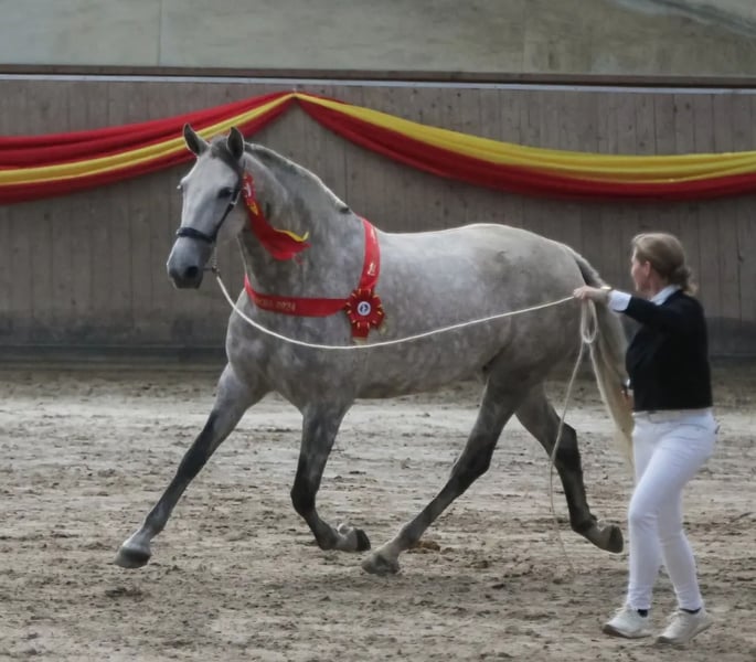 EXCEPTIONAL PRE BROODMARE FOR SALE Duquesa CB II - One of Denmark's finest PRE mares. BASIC INFORMATION • Name: Duquesa CB II • Age: 9 years • Height: 167 cm • Color: Grey • In foal to the prestigious stallion Monje II - due April 2025 Video: https://www.facebook.com/reel/1642203446358184 ACHIEVEMENTS • DAMOCHA 2024: Champion Mare and Best Movements in Class • DAMOCHA 2022: Champion Mare • SICAB 2018: Placed 16th out of 50 two-year-old mares • Daughter (born 2023) Best Yearling Filly at DAMOCHA 2024 (Also by Monje II) BLOODLINES • Sire: Simpatico de Millan III (Joven Reproductor Recomendado) • Grandsire: The legendary Fer Bago - two-time SICAB Champion HEALTH AND HANDLING • Completely sound and healthy • Recently vaccinated (January 2025) • Barefoot • Clean X-rays from 2022 • Easy to handle in daily routines: o Calm and sensitive temperament o Loads easily o Easy keeper USE Duquesa CB II is the perfect mare for the serious breeder looking to strengthen their breeding program with a champion mare of the highest quality. Her exceptional movement, proven show record, and outstanding offspring make her a rare opportunity