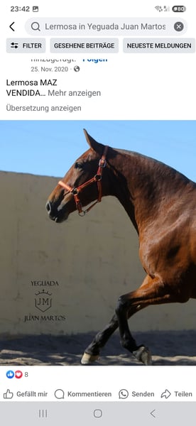 Lermosa MAZ stammt ebenfals wie Silueta MAZ aus der Zucht von dem bekannten PRE Züchter Juan Martos, am 10.02.2014 ist sie in Spanien geboren. Sie hat mit ihren 164cm eine optimale grösse und ist eine Barocke Stute, mit einem Kräfftigen Hals und einer sehr spekulieren Begegung. Sie hat eine sehr gute Abstammung, Väterlicherseits hat sie eine Yegada Militar Abstammung, Mütterlicherseits eine Escalera Abstammung. Lermosa ist mit einem Körindex von 106,90 bei ANCCE überdurchnittlich gut gekört, was sehr für ihre Qualität von Lermosa spricht. Sie ist angeritten, muss aber wieder aufgefrischt werden. Sie ist eine sehr gute Mutterstute. Lermosa ist tragend von Oreon Maz auf 01.03.2026. Sie ist Schmiede und verladefromm. V: Sinapsis, MV: Peluso VI
