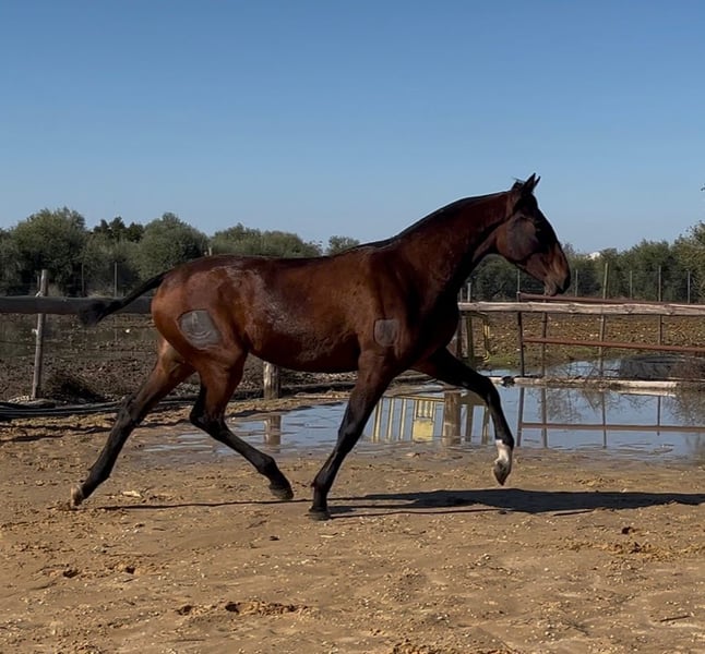 Diese wunderschöne Stute besticht durch ihr außergewöhnlich gutes Gangwerk. Mit ihren zwei Jahren, weiß sie sich zu bewegen. Das wird eine tolle Stute, die sich für die Dressur oder auch für die Zucht empfiehlt. Im Umgang ist brav und gut erzogen. Ist halfterführig und kennt auch schon das Putzen. Ihre Abstammung ist vom Feinsten. Ihr Vater ist der große Rappe Nelson (Yeguada Militar), sein Vater Gerente geht auf Remache zurück. Ihre Mutter vereint Candau Blut, Esclaera und den bewegungsstarke Vinatero III Das Pferd wird im Auftrag verkauft. Er kann gerne bei uns noch in Beritt bleiben. Eine AKU wird kurzfristig organisiert. Internationaler Transport.