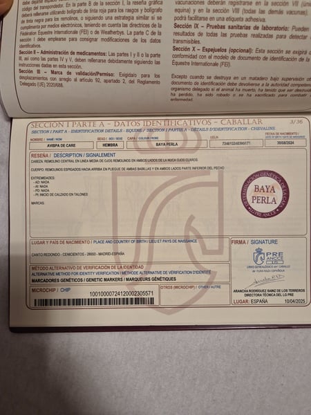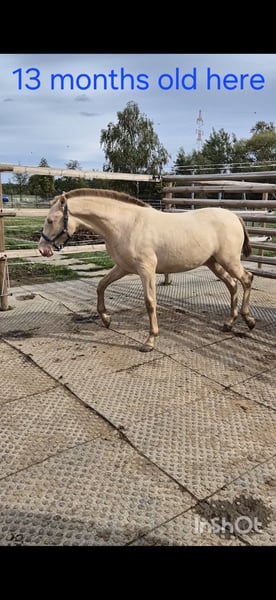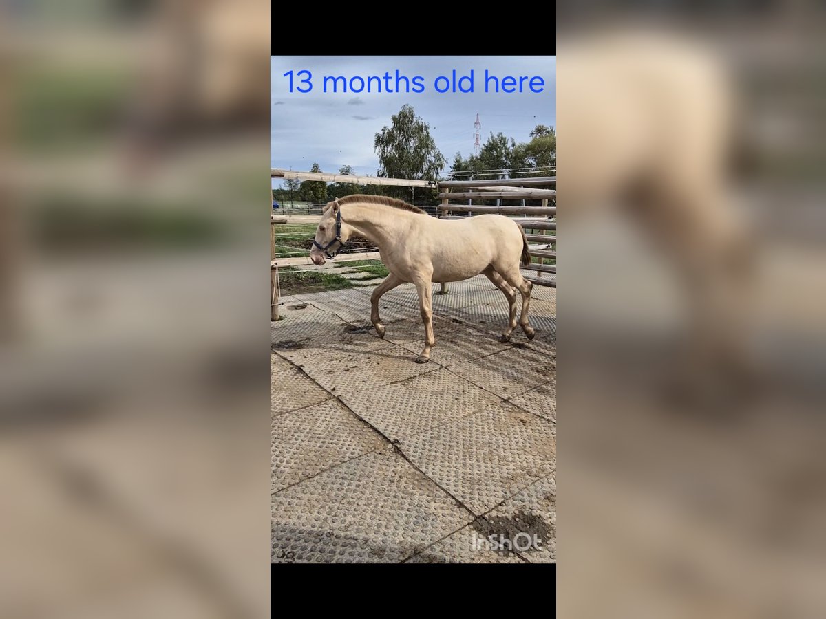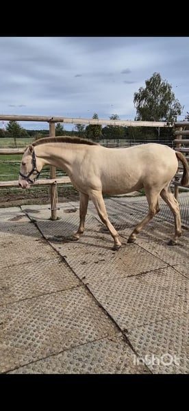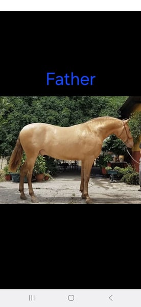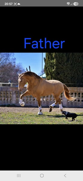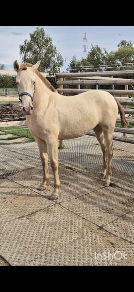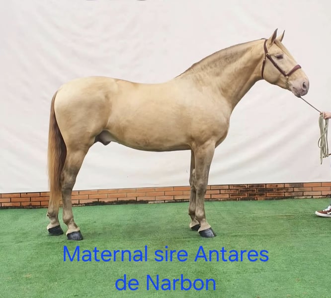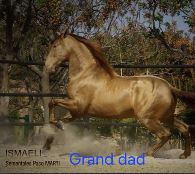 Exceptional mare with golden coat for sale. Perfect body structure, perfect, graceful movement. Very tall, baroque, beautiful full-grown mare for her age. She will be 2 years old in August. Great pedigree. Grandfather Ismaeli from Yeguada Paco Marti, sire Romance Abad, one of the best stallions in all of Spain. Maternal sire Antares de Narbon. A unique opportunity for those looking for a quality mare for breeding. This is a guarantee of future quality foals. Do not hesitate, because the price will increase rapidly with her age.