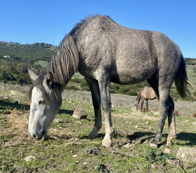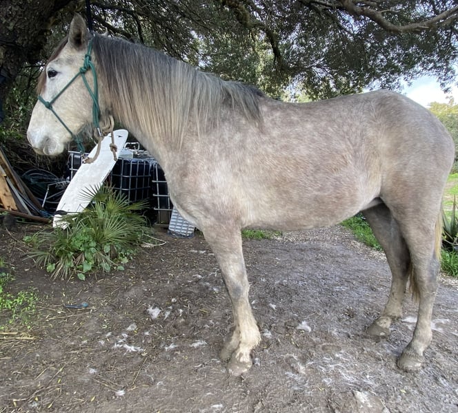 Esta hermosa y muy cariñosa yegua PRE está en venta, ya que voy a quedar demasiado pesado para ella. Lamentablemente, porque es una yegua robusta, pequeña, compacta y de tipo baroque, que aprende muy, muy rápido y será la mejor amiga de alguien, ya que es muy afectuosa y necesita cariño. Cumplirá tres años en marzo. Después de solo dos paseos, ya confiaba plenamente en mí, y tras dos sesiones de manejo con cuerda, ya pude trabajar con ella en libertad. Seguimiento libre, trotar hacia mí, y trotar y caminar en círculo sin cuerda. Todo muy dócil y amigable. También se puede tocar en cualquier parte y no hay problema con el cuidado de los cascos. El galope es con rebote. Es adecuada para jinetes ligeros o niños muy cariñosos. No es apta para reproducción, ya que sufrió un edema en la ubre debido a una garrapata. Actualmente vive con su media hermana y cuatro machos en un paddock de 5 hectáreas con pasto.
