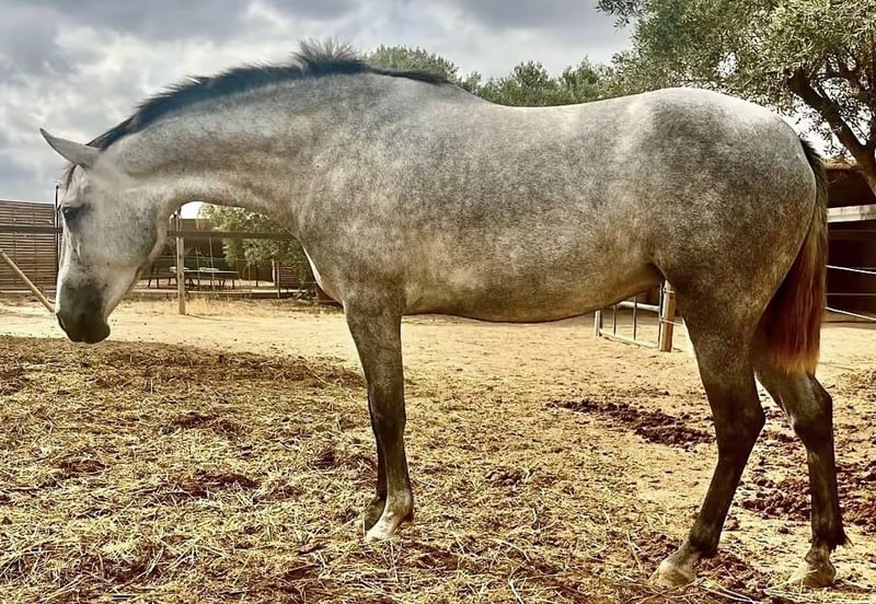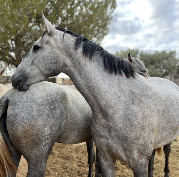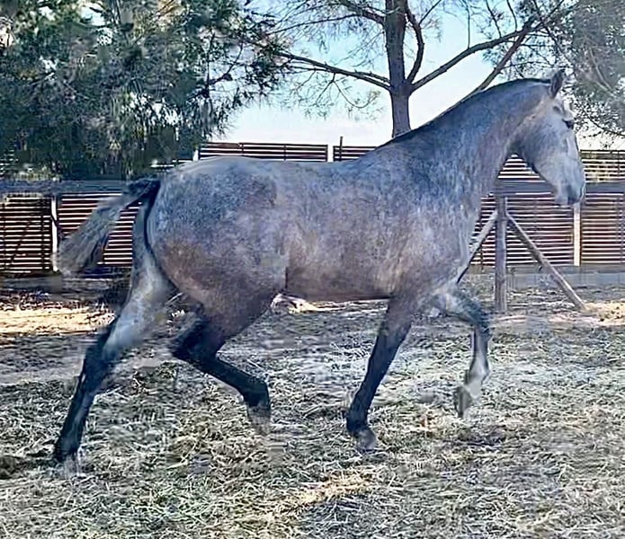 Voladora XLIX, una bellissima puledra, elegante, con movimenti molto buoni, sana, non montata, sempre in branco in libertà. Abituata alle persone, al contatto con me, ai cani. È una puledra molto buona per iniziare a lavorare con lei, interessante anche per il dressage. I suoi genitori si muovono molto bene, interessante anche come fattrice, può dare movimenti e suo padre è un stallone di mantello nero, la madre ha il mantello grigio pezzato, quindi Voladora può anche dare mantello baio/nero ai suoi figli. Cerco una buona nuova casa per lei (insieme o separatamente con l'altra puledra/giumenta di 4 anni Velera XVII). Parlo anche tedesco (sono tedesca).