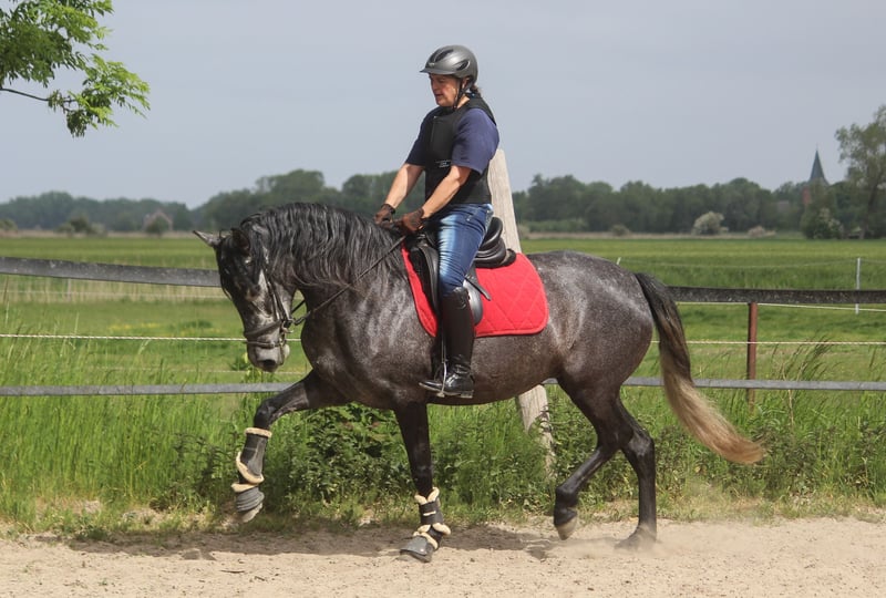 Guadalupe is undoubtedly an exceptional horse. She trots with incredible mechanics. Her knee action is spectacular and is accompanied by enormous power from the hindquarters. This sets her apart from many other PREs that show knee action but lack the engine. Guadalupe has three very good basic gaits. She is a large, strong mare with a good foundation. The mare comes from our sport-oriented PRE breeding in Northern Germany. Both her father and her grandfather also have above-average movements. Guadalupe is quite spirited in handling, but like a typical Iberian, she is very, very sweet under saddle. It would be wonderful if this mare is further developed and also enters into competitive sports. Her full brother is ridden by a 16-year-old girl and has achieved 9 placements in 11 starts at FN competitions in his first year.