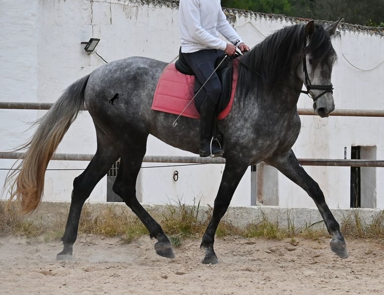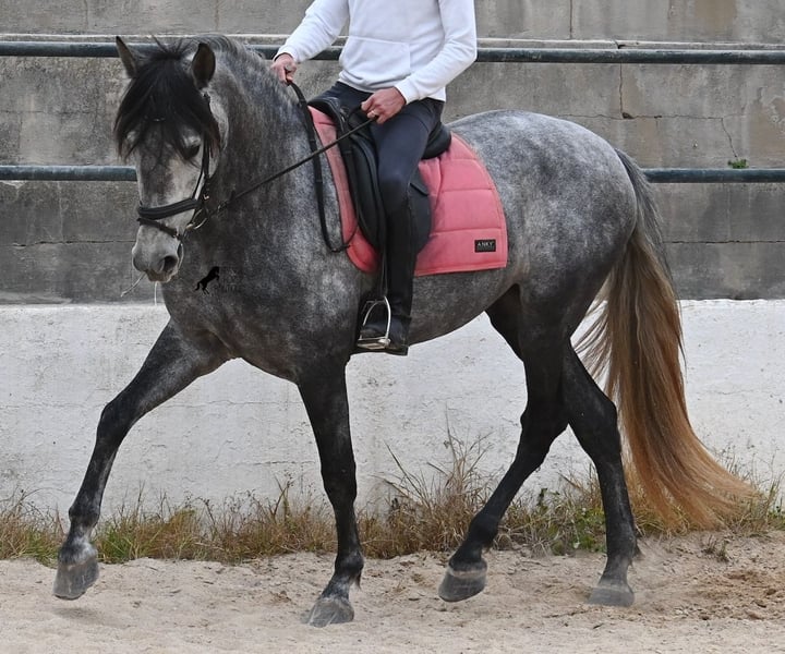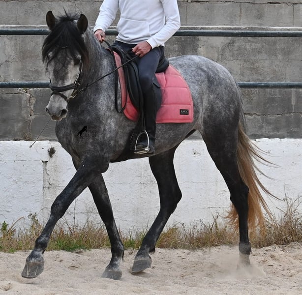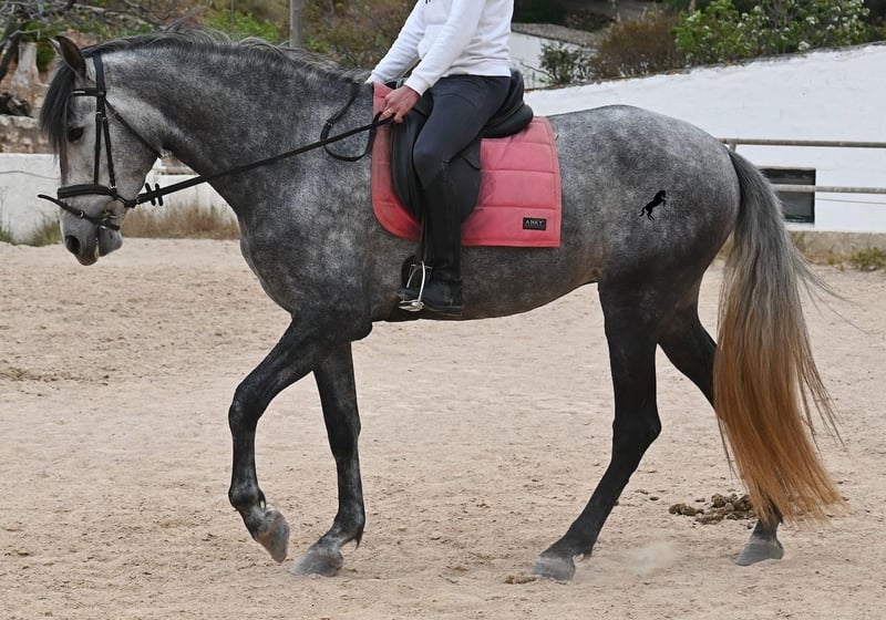 Dieses mit schon beachtlichen 170cm große Pferd, ist ein reinrassiger PRE von 2022 (Andalusier mit Rassenachweis der ANCCE) und eingetragen als Stute. Doch dieses Wunder der Natur, ist wie sich später herausstellte, auch mit männlichen Genitalstrukturen ausgestattet. Umgangsprachlich würde man Zwitter sagen, was dich nun bestimmt stutzig macht beim Lesen aber defacto ist dieses Sonderwesen so von der Natur kreiert worden :) Da es der ursprüngliche Plan war zu züchten, was nun nicht möglich ist, da keine Rosse eintritt und der doppeltgeschlechtliche Zustand den Hormonhaushalt nicht mit anderen Pferden vergleichen lässt, wird nun ein Lebensplatz für dieses Pferd gesucht und das zu einem sehr niedrigen Preis. Das Pferd wird nun angeritten und kennt aktuell das Reitergewicht in Schritt und Trab ohne Longe (für Galopp wird noch an der Balance gearbeitet). Was zu beachten ist, eine Herdenhaltung ist in dem Fall nur bedingt möglich- männliche Pferde reagieren teilweise hormonell auf das Pferd und der Hengstanteil zeigt sich gerne stolz und männlich. Auf Stuten reagiert der Hengstanteil auch, somit wäre nur eine Wallachhaltung bedingt möglich, was aber auch probiert werden müsste. Aktuell ist die Haltung in der Box und ohne Probleme, sowohl mit Hengsten als Nachbarn, als auch mit Stuten am Stall. Das wäre vermutlich auch die beste Option der Haltung, in Paddockbox oder Box, um sicherzugehen, dass beide Anteile im Pferd, in Harmonie leben können. Eine "chemische Kastration" ist vermutlich auch nicht erfolgreich, da der Hormonhaushalt anders in dem Pferd funktioniert. Für eine operative Kastration fehlen die Hoden. Ein ganz spezielles, espritvolles Pferd, was sich gut als Reitpferd entwickelt und auch sehr schick ist- für kleines Geld! Der Standort ist Menorca. Gerne organisiere ich vor Ort eine AKU,Transport oder auch ihre Reise, sollten Sie persönlich zum Anschauen kommen. Details dazu gerne auf meiner Seite oder im Gespräch. Saludos aus Spanien