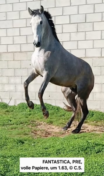..Eine ausdrucksstarke PRE STUTE, volle klasse Papiere, mit wunderschönem Kopf, und guten Bewegungen, der sehr viel Zeit gelassen wurde.🥰. Z Zt. Um 1.62 groß. Kein Lampenaustreter, sondern ein Rücken und ein Exterieur welches auf viel Sitzkomfort schließen lässt🖕 Am 20.03.26 wird sie 5 Jahre alt, ist gut erzogen, kennt longieren und ist nun top bereit zum Einreiten 👌 Gerne kann sie bei uns noch in Ausbildung bleiben. Ab 3 Monaten machen wir Paketpreise. Meldet Euch auf WhatsApp 0034 670 097 903, Eure Carmen