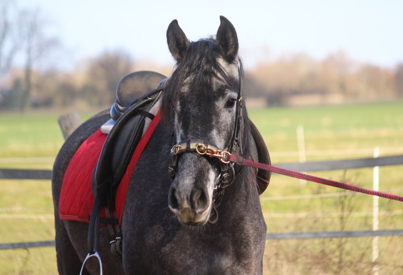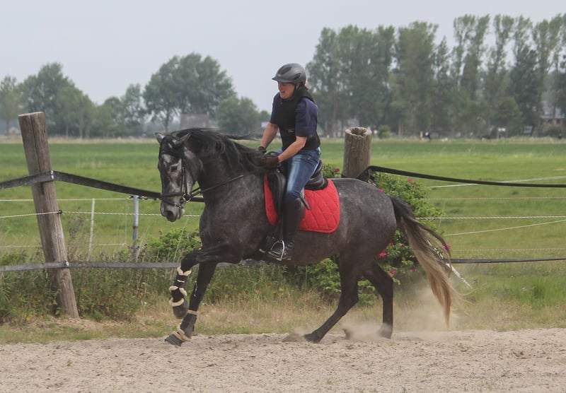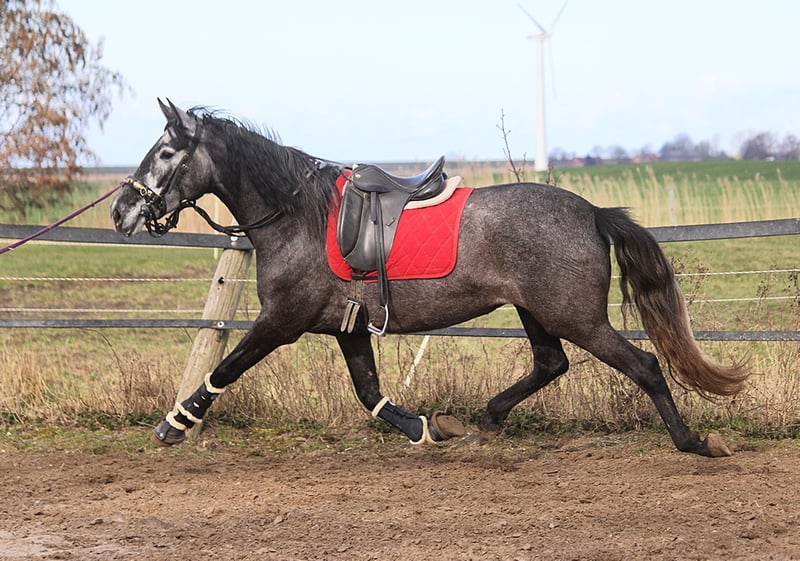 Guadalupe est certainement une jument exceptionnelle. Elle trotte avec une mécanique incroyable. Son action de genoux est spectaculaire et est accompagnée d'une énorme puissance provenant de l'arrière-main. Cela la distingue de nombreux autres PRE, qui montrent certes une action de genoux, mais qui manquent de moteur. Guadalupe possède trois très bonnes allures de base. C'est une grande jument robuste avec un bon fondement. La jument provient de notre élevage PRE orienté vers le sport dans le nord de l'Allemagne. Son père et son grand-père ont également des mouvements au-dessus de la moyenne. Guadalupe est amicale dans ses interactions et, comme un ibérique typique, elle est très, très douce sous la selle. Le frère plein de Guadalupe a obtenu 9 classements en 11 participations lors de sa première année dans des concours FN.