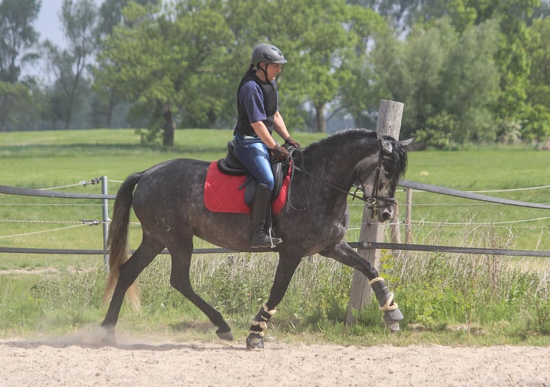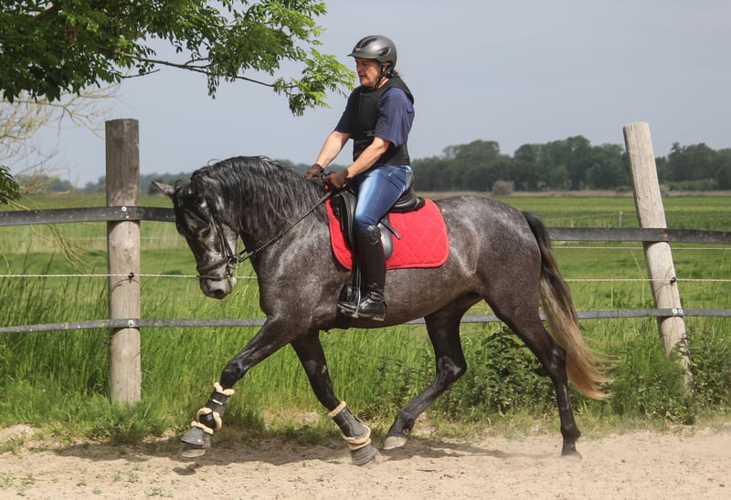 Guadalupe is undoubtedly an exceptional horse. She trots with incredible mechanics. Her knee action is spectacular and is accompanied by enormous power from the hindquarters. This sets her apart from many other PREs that show knee action but lack the engine. Guadalupe has three very good basic gaits. She is a large, strong mare with a good foundation. The mare comes from our sport-oriented PRE breeding in Northern Germany. Both her father and her grandfather also have above-average movements. Guadalupe is quite spirited in handling, but like a typical Iberian, she is very, very sweet under saddle. It would be wonderful if this mare is further developed and also enters into competitive sports. Her full brother is ridden by a 16-year-old girl and has achieved 9 placements in 11 starts at FN competitions in his first year.