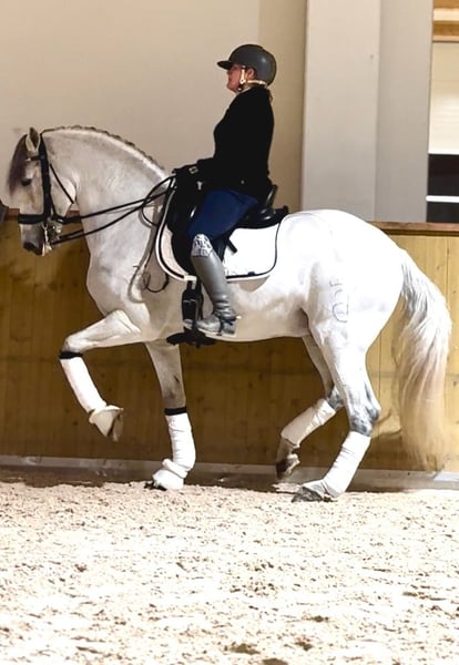 Elegant PRE Gelding for sale ✨ Discover the beauty and grace of this stunning grey PRE gelding, born in 2016. Standing at 166 cm, he combines impressive stature with a refined presence. Professionally trained in dressage by an olympic rider, he offers smooth, expressive movements and a willing temperament, making him an ideal partner for riders seeking quality and elegance. Can be ridden by leisure rider but have the ”go” for more higher level training. He is also super sweet to handle, sensitive but always absolutely kind, no bad bone in his nature. Whether you're aiming to compete or enjoy very quality leisurely rides, this versatile horse is ready to meet your needs. Does good and easy piaffe, nice elevated trot and passage, does laterals, training pirouettes, simple changes. Changes are quite easy, can not imagine that tempis would have any issues. Never says no, shoeing, loading, travelling, vetting, hacking etc are without a problem. Whole history and backround is known, have been for same owner since 2,5y old. No vices or known health issues.