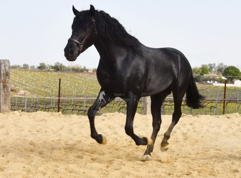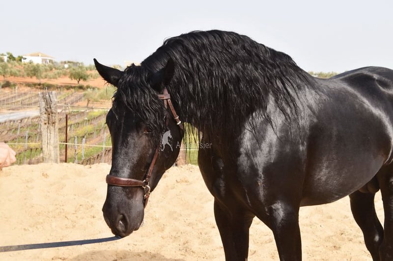 Carácter dulce, juguetón, rústico, grande, de tipo barroco. Pedigree: Antonio Cuenca Delgado, Escalera, Bohorquez, tatarabuelo Manzanillo XII. Está calificado. www.elegante-andalusier.com