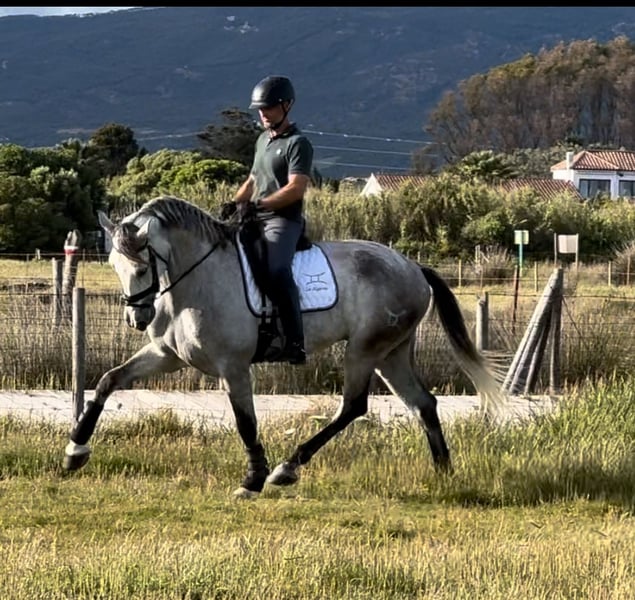 5-jähriger, kastrierter PRE-Hengst. 1,75 m Stockmaß. Sportliche Statur. Drei sehr gute Gangarten. Ideal für die Dressur. Gewöhnt an Ausritte ins Gelände. Mit viel Arbeitswillen und leicht zu handhaben. Ohne jegliche Laster und mit sehr gutem Charakter.