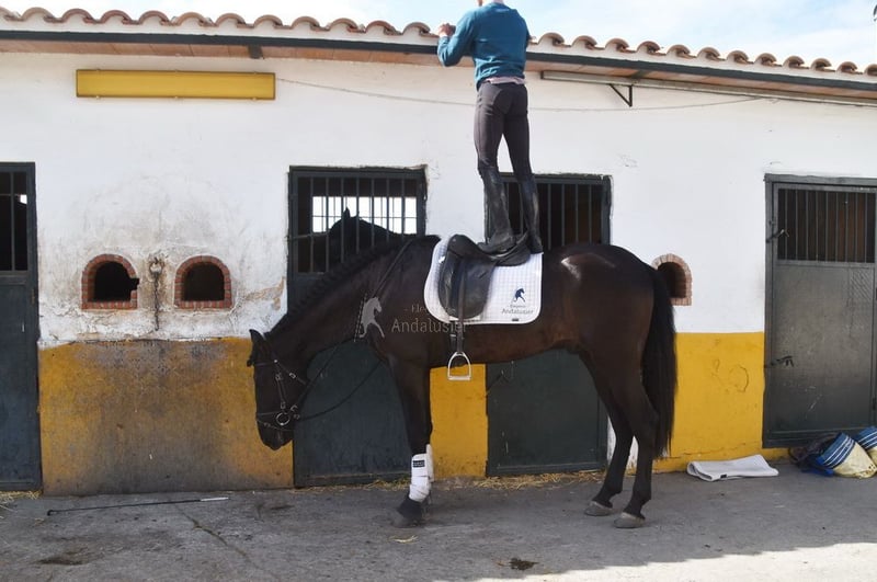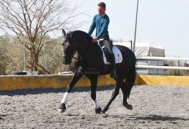 Caractère doux et calme, attentif, curieux, affectueux. Monté en allures de base. Très grand. Situé en FRANCE. Ascendance : Las Colonias de Pesqueril, Granda Losada. www.elegante-andalusier.com