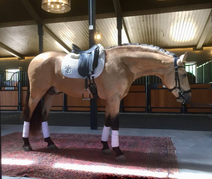 Wenn Sie auf der Suche nach dem "Wow-Faktor" sind, ist Rayito Ihr Mann. Rayito wurde 2016 geboren und wurde als Jährling in die USA importiert. Er wurde von einem portugiesischen Trainer unter dem Sattel begonnen. Er hat drei reine Gangarten, einen sehr bequemen Trab zum Sitzen und einen schönen Galopp. Er wurde bereits auf einigen Turnieren vorgestellt, unter anderem auf der 2. Zurzeit trainiert er die Bewegungen der Klasse 3 unter der kompetenten Anleitung eines klassischen Trainers aus Portugal. Er hat ein charmantes und verspieltes Auftreten und reift wunderbar unter dem Sattel. Er steht über 16H, nicht ganz 16.1H und hat einen vollen Lauf, einen breiten Körper, der Ihr Bein einnimmt ~ jeder vermutet, dass er 16.2H ist. Rayito ist verspielt, bezaubernd und bereit, sich mit seinem Menschen für immer zu verbinden. Er weiß, dass er etwas Besonderes ist. Er ist gesund und selbstbewusst, nicht ängstlich und hat Erfahrung im Gelände. Er ist am besten für einen selbstbewussten Reiter geeignet, der ein kraftvolles Pferd mag, das auf leichte Hilfen reagiert. Er ist USDF/USEF-registriert, ANCCE-geprüft und wird ein fantastischer Partner in und außerhalb der Arena sein. Er befindet sich in Aiken, SC. Zusätzliches Video ist verfügbar, kontaktieren Sie uns für weitere Details.