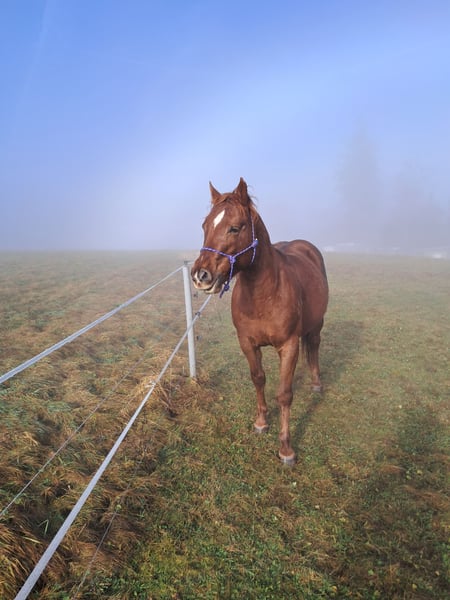 Wir suchen für unseren, sehr nervenstarken, freundlichen Quarter Hengst ein verstänisvolles neues Zuhause. Goldi, so nennen wir den Hübschen, ist 5,5 Jahre alt, ca 148 cm groß ,mit einer sehr schönen rotgoldenen Farbe. Er ist noch nicht geritten, kennt jedoch das alleine mit dem Menschen spazieren gehen und ist da sehr zügig unterwegs, er lässt sich von nichts beeindrucken, egal was am Wegesrand steht oder liegt oder sich bewegt. Goldi war schon im Deckeinsatz und ist immer händelbar. Gegenwärtig läuft er mit einer Stute und einem Wallach auf der Weide, er ist sehr tolerant. Warum wir Goldi weiter geben, er und ich, finden leider nicht zusammen. Irgendwie hab ich den Eindruck daß er eher ein Männerpferd ist. Goldi lebt im Offenstall, das soll auch im neuen Zuhause so sein, er braucht viel Platz um zufrieden zu sein. Auch hat er einiges an Temperament, das sieht man wenn er mit den anderen Pferden über die Weiden galoppiert, Kopf im Wind und den Schweif über den Rücken. Und, Goldi hat offensichtlich den Cow Sense, das zeigt er, wenn er ein Pferd 'absondert'. Zuhause ist Goldi im schönen Südschwarzwald. Für mehr Informationen,sowie ,weiteren Bilder und Videos, stehen wir sehr gerne telefonisch zur Verfügung. Uns ist ein persönliches Gespräch wichtig. Und bitte, bedenkt, ob Ihr einen Stall habt und auch die finanziellen Mittel, für ein Pferd. Herzliche Grüße und eine gesegnete, freudvolle Weihnachtszeit .