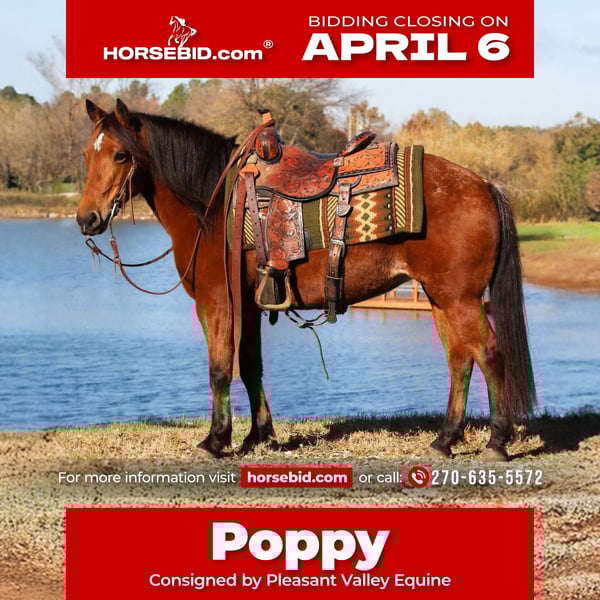 🌟𝑨𝒑𝒓𝒊𝒍 𝐀𝐋𝐋 𝐒𝐓𝐀𝐑 𝐋𝐈𝐍𝐄𝐔𝐏🌟 Happening now thru MONDAY | APRIL 6th - Available EXCLUSIVELY on HorseBid's website! For more details and to register visit: www.Horsebid.com CONSIGNOR CONTACT: Pleasant Valley Equine 270-635-5572 LOCATION: Robards, KY BREED: Quarter Pony REGISTERED: No COLOR: Bay HEIGHT: 13.3 AGE: 12 GENDER: Mare Meet Poppy the Pony, a 12-year-old, 13.3 hand mare weighing right around 900 pounds who is as dependable as she is enjoyable to ride. Poppy has been extensively trail ridden through all types of terrain and confidently goes wherever you place her—whether that’s leading the group, cruising in the middle, or bringing up the rear. She has wonderful ground manners and stands politely for saddling, bathing, and the farrier like a proper lady. Poppy has been barefoot her entire life and boasts excellent, well-maintained feet. Recently, she has been in training where she’s continued to progress nicely, catching her leads, side passing, and backing with ease. She has also been ridden English and has started trotting over ground poles and small jumps, showing versatility and a willing attitude. Poppy sells 100% sound in every way and would be best suited for an intermediate rider looking for a fun, well-rounded pony to enjoy both on the trails and in the arena. Call us today to set up an appointment to meet Poppy!
