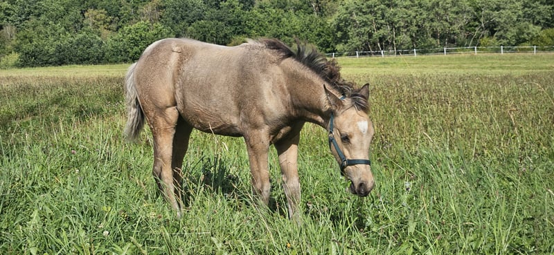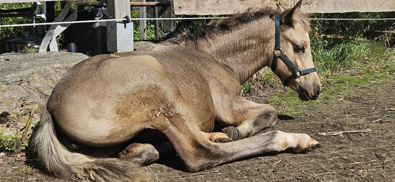 PLATZ VOR PREIS! Die kleine Willow sucht wegen Reduzierung ein Traumzuhause. Sie zeigt sich jetzt schon sehr selbstbewusst und neugierig. Eine echte Zuckermaus. Egal ob für den späteren Sport, Freizeit oder für die Zucht. Ihre Mutter ist ein deutsches Reitpony und ihr Papa ein Quarterpony. Sie ist ein Buckskin hat ein tolles Gangwerk und ein schönes Exterieur. Eher ein ruhiger Typ. Geboren am 10. Juni 25. Sie lebt bei uns im Offenstall in einer gemischten Herde mit ihren Geschwistern. Ihr Endmaß liegt bei ca. 148 cm. Sie bekommt wie ihr Vater Quarterpony Papiere. Wer das Besondere sucht sollte sie sich ansehen. Sie kann gern noch bis zum Frühjahr zur Aufzucht bei uns bleiben. Weitere Infos und Videos gern auf Anfrage. Bitte nur erst geneinte Anfragen. Es fällt uns schon schwer genug sie abgeben zu müssen.