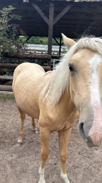 Aus persönlichen Gründen biete ich meine liebevolle, zweijährige Palomino Stute zum Verkauf an. Miley wächst artgerecht im Herdenverband auf und zeigt sich dabei sehr sozial, neugierig und menschenbezogen. Sie wird voraussichtlich ein Stockmaß von ca. 155 cm erreichen. Mutter und Vater können beide vor Ort am Stall besichtigt werden. ✨ Eckdaten & Ausbildung: • Geboren am 20.04.2024 • Farbe: Palomino • Endmaß ca. 155 cm • Aufgewachsen im Herdenverband • Kennt Hunde, Katzen, Traktoren & Kinder • Beherrscht das Fohlen-ABC • Anhängerfahren gewohnt • Regelmäßig beim Hufschmied vorgestellt • Regelmäßig geimpft & entwurmt Sie ist altersgerecht erzogen, brav im Umgang und zeigt ein ausgeglichenes, freundliches Wesen. Damit eignet sie sich ideal als zukünftiges Freizeit- oder Reitpferd für liebevolle Hände.