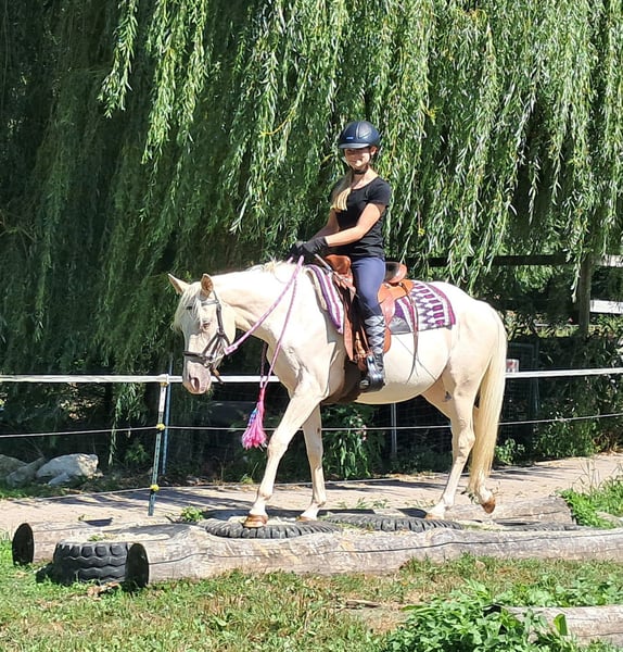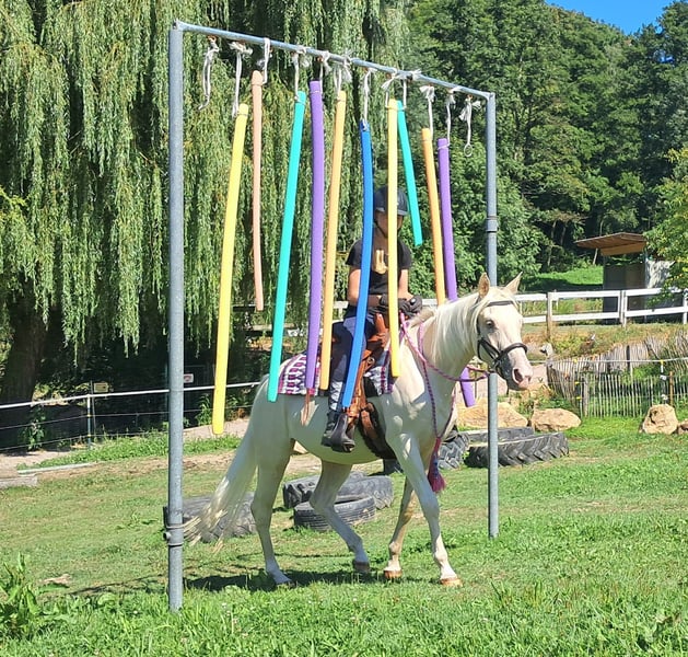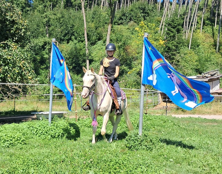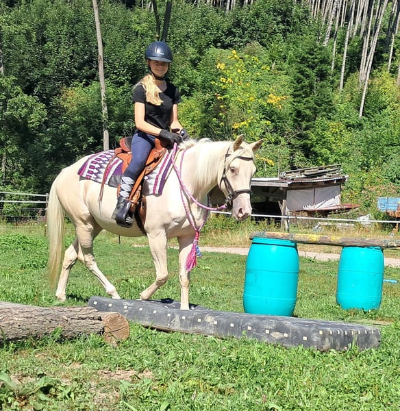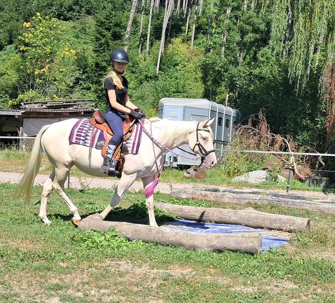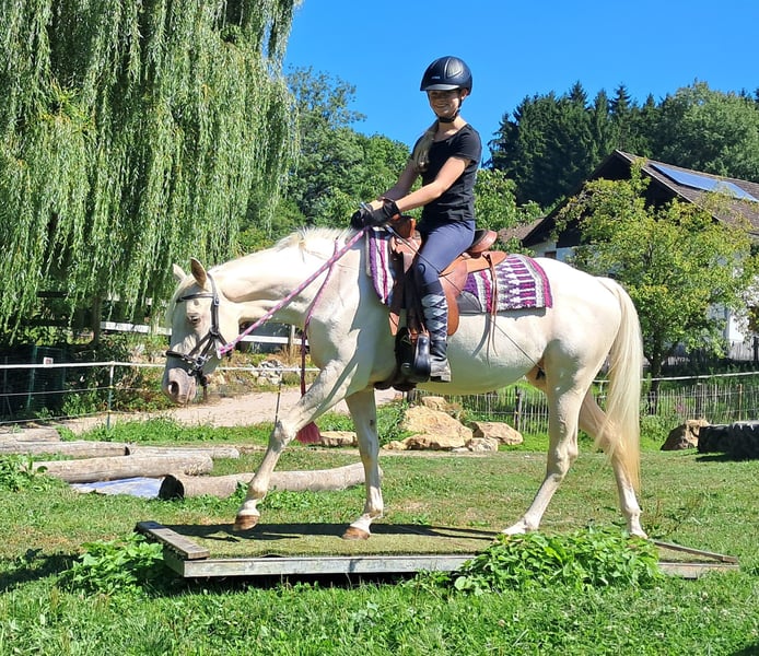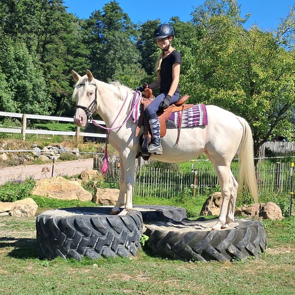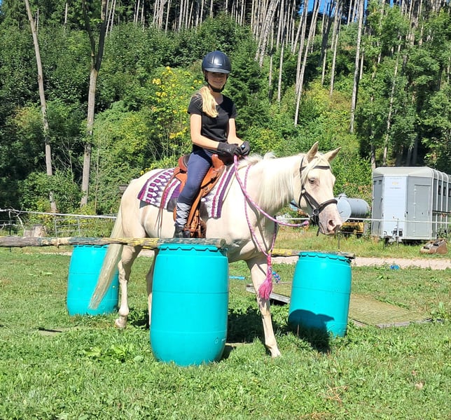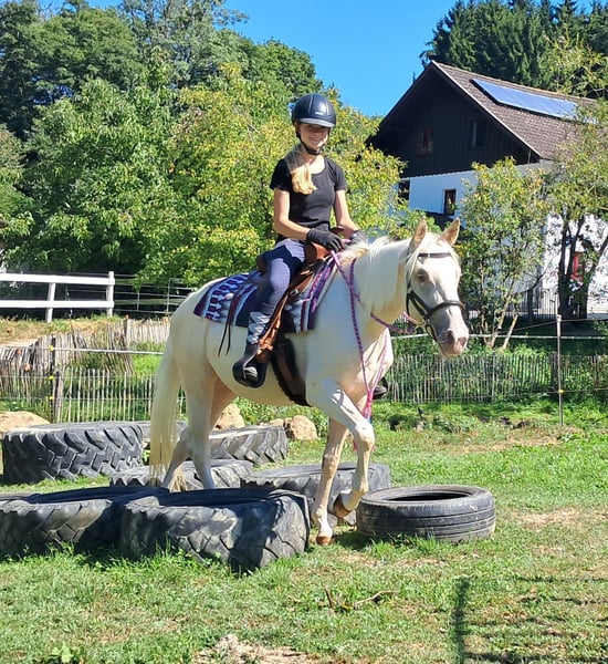 Kizzi ein Traumpony in traumhafter Farbe. Freundliche, wunderschöne Stute die nichts aus der Ruhe bringt, bestens sozialisiert, absolut unkompliert bei allem, unerschrocken, extra brav, sehr sitzbequem, freizeitmäßig geritten, bereit für neue Abenteuer, Prämienfohlen, beide Elterntiere frei von genetischen Krankheiten, inkl. amerikanischem Zuchtpapier, aktuell 140 cm, 3 1/2 Jahre. Für Wander-, Gelände-, Therapie- und Freizeitreiten. Englisch und Western ist beides möglich. Offenstall und Herdenhaltung gewöhnt, Box ist auch kein Problem. Equidenpass vorhanden. Alle unsere Pferde kennen Bodenarbeit, unterschiedliches Gelände, Autos, landwirtschaftliche Maschinen, sowie Kühe, Esel, Schafe, Schweine, Hunde, Katzen und Hühner. Infos und Terminabsprache unter 08536-2890292 (AB vorhanden) oder 0157-78378455 (am Hof kein Mobilnetz). Bitte keine PN, Mail und WhatsApp Anfragen!! Sonntag Ruhetag. Zubehör und Transport günstig möglich. Jedem Kunden wird ein vertraglich festgesetztes Umtauschrecht von 6 Wochen eingeräumt. Preise sind Festpreise. Keine Anfragen auf Ratenzahlung erwünscht. Wer gleich mit Anhänger kommt und mitnimmt erhält 100€ Rabatt. Bei Kauf werden 1000€ in bar als Anzahlung fällig. Wer das Pferd gleich mitnehmen will, muss selbstverständlich komplett bezahlen. Wir absolvieren mit den Kunden einen Ausritt mit zwei Pferden Eurer Wahl, damit Ihr Euer Traumpferd kennenlernen und prüfen könnt ob es das richtige Pferd für Euch ist. Jeder Termin kostet 35€, egal ob reiten, vorreiten, bereitstellen, spazieren ... jeder weitere Reiter (Freundin, Freund, Schwester, Trainer...) bezahlt das selbe wenn er mitreitet, nur mal schauen kostet uns auch Zeit und somit 20€. Der Betrag wird beim Kauf eines Pferdes am selben Tag wieder erstattet. Aufgrund mehrfacher Vorkommnisse bitten wir darum wahrheitsgemäße Angaben über das Reitergewicht zu machen. Bei nicht wahrheitsgemäßen Angaben behalten wir uns vor, uns vor Ort gegen einen Proberitt zu entscheiden. Unseren Pferden zu Liebe möchten wir auch unseren gut gebauten Pferden nicht mehr als 120kg zumuten. Da es sich hierbei um ein lebendes Tier handelt, sind dies lediglich Eindrücke des Betreuers und keine zugesicherten Eigenschaften des Pferdes. Weitere Pferde/Ponys in meinen anderen Anzeigen oder auf Anfrage.