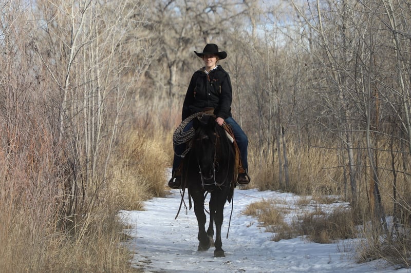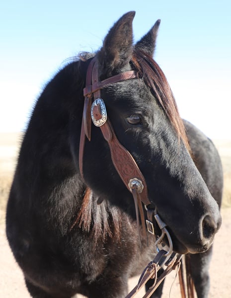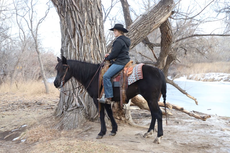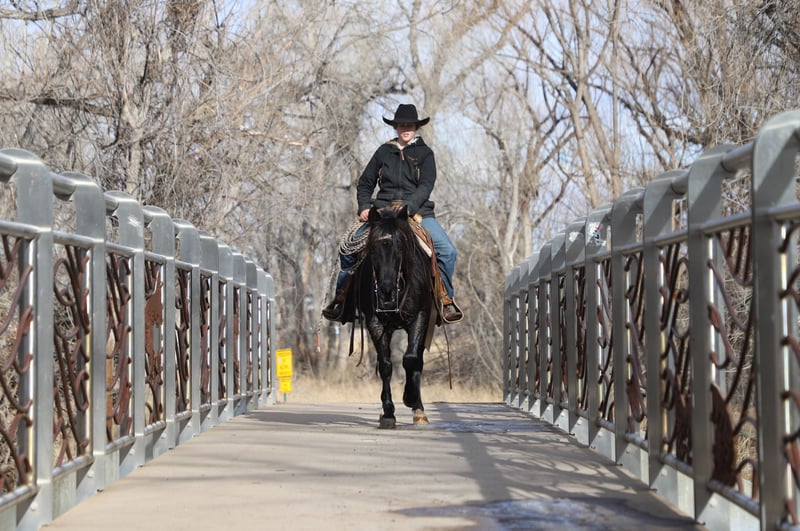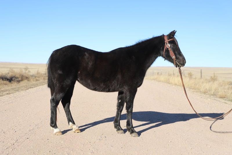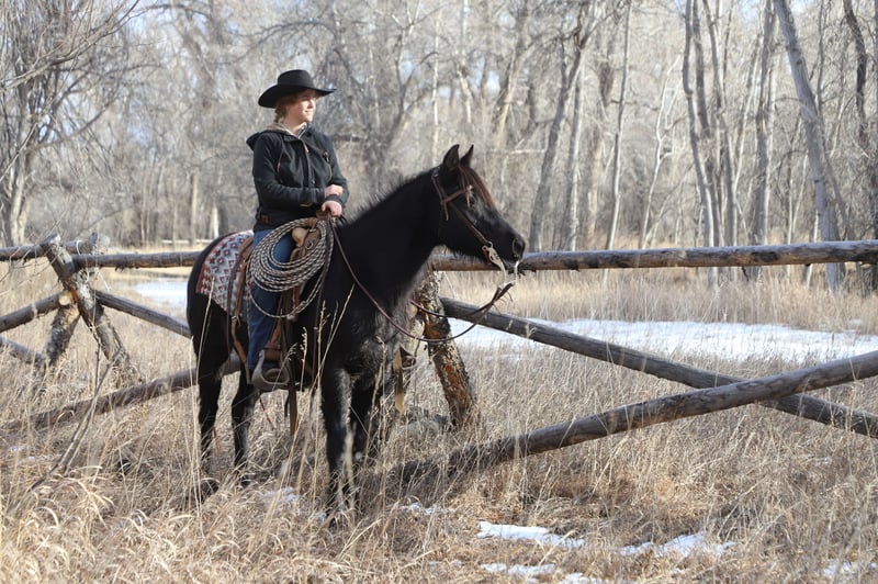 "AVAILABLE ON ONLINE HORSE AUCTION AT www DOT MagicHorseAuction DOT com BIDDING OPEN NOW thru TUESDAY | MARCH 3RD! BUY IT NOW AVAILABLE! *Final price will be determined on auction site* CONSIGNOR CONTACT INFO:Oly Edmiston #970-556-4820 LOCATION: COLORADO" Midnight is a good natured blue roan quarter pony mare. At nine years old, she is prime age. She has been a favorite here on our ranch, calving and moving cows. She is a quiet and confident trail partner in the mountains and on municipal trails. Midnight is smooth in all her gaits and happy to lead, follow, or be anywhere in between on the trail. She rides out alone on the trail or checking cows, and has done so with each of our older kids aged 9, 12, and 14. Midnight has drug calves at brandings and roped calves for tagging and doctoring. She has also head and heeled yearlings. Midnight is in on consignment with us. Her owners are selling her to cover medical bills. They said that midnight is a very fine buggy mare and good to drive anywhere. We have not had the occasion to hitch her but may have video before the sale is over (weather permitting). Midnight gets along well in the herd and is vet and farrier approved. She loads and hauls well, and backs out of the trailer. Shipping is available. Call for more information or to set up a time to meet her at home near Nunn, CO. 970-556-4820