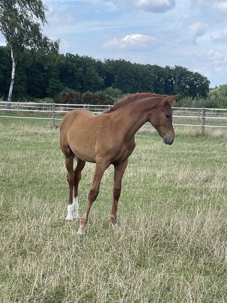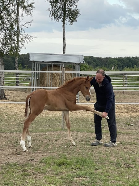 Unfortunately, we cannot raise stallions here, so we are looking for a 5* home for our Night Agent starting at the end of September. Father: Next Golden Champion MF (147cm) (Next Diamond x Golden Wesr) Mother: Sandro Hit x Brentano 2 (170cm) He is already very tall and will definitely exceed 160cm. Current height is 140cm. Registered as a German Riding Pony. Full papers, approved for breeding in the Rhineland. The mother is a performance mare and was herself successful up to the advanced class. The father is highly successful in riding horse tests with scores between 8-9.0! Character 10.0, a foal to fall in love with for sport or as a high-quality leisure partner. Absolutely place before price! He deserves to have a 5* home because he simply does everything right :) Can move out immediately, born mid-April.