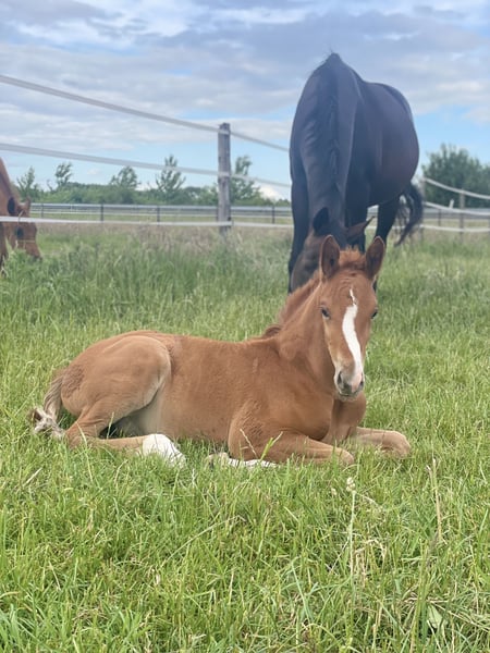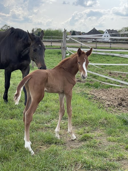 Leider können wir bei uns keine Hengste großziehen, daher suchen wir für unseren Night Agent ein 5* zu Hause ab Ende September. Vater: Next Golden Champion MF (147cm) (Next Diamond x Golden Wesr) Mutter: Sandro Hit x Brentano 2 (170cm) Ist jetzt schon sehr groß, wird auf jeden Fall über 160cm. Aktuelles Stockmaß 140cm. Eingetragen als Deutsches Kleines Reitpferd. Volles Papier, körfähig im Rheinland. Mutter ist Leistungsstute und war selber bis zur schweren Klasse erfolgreich. Vater hoch erfolgreich in Reitpferdeprüfugen mit Noten zwischen 8-9,0! Charakter 10,0, ein Fohlen zum Verlieben für Sport oder als gehobener Freizeitpartner. Absolut Platz vor Preis! Er verdient es ein 5* zu Hause zu bekommen, da er einfach alles richtig macht:) Kann sofort ausziehen, geboren Mitte April