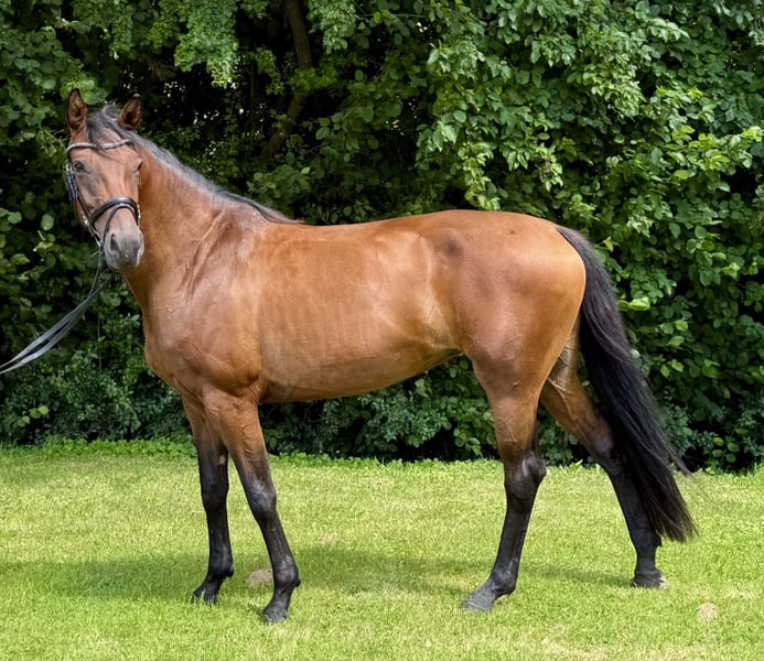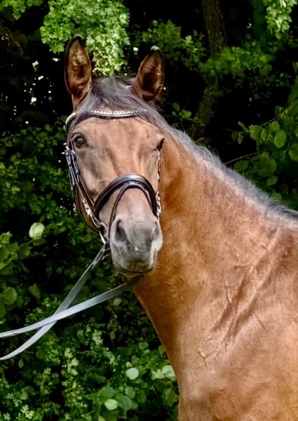 Aus eigener Zucht steht unsere 5-jährige, kompakte Rheinländer Stute zum Verkauf. Sie stammt aus unserer leistungsgeprüften Staatsprämienstute und bringt beste Dressurabstammung aus einer verantwortungsvollen und professionellen Zucht/Aufzucht mit, wir sehen sie dennoch als Allrounder, da sie sich im Gelände trittsicher und bei den ersten Trainingseinheiten beim Springen recht talentiert zeigt. Sie ist von Fohlen an regelmäßig entwurmt und einem Schmied vorgestellt worden. Unsere Pferde werden ebenfalls bei Bedarf physiotherapeutisch vorgestellt. Die Fohlen wachsen in einer gemischten Stuten-/Mutter-/Fohlen-Herde auf und stehen, bis sie uns verlassen, mind. 10 Monate im Jahr 24/7 auf großen Weiden. Die Stute wurde spät, nach einer Fohlenpause, vom Züchter angeritten, sie kennt Halle, Platz und Gelände in allen Grundgangarten. Charakter: umgängliche, wesensfeste Stute mit gutem Arbeitswillen Da wir vor dem Anreiten oder Besamen unserer Pferde vorsorglich Röntgenbilder von Rücken und Beinen fertigen lassen, liegen ältere Röntgenbilder vor - ohne Befund Wir wünschen uns für unsere Stute eine/n ambitionierte/n, feinfühlige/n Reiter/in mit Erfahrung, der/die Freude an der weiteren Ausbildung eines jungen Pferdes hat. Bitte mit Weidehaltung und Sozialkontakten!