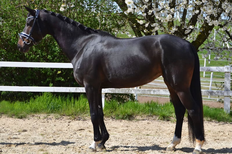 For sale is a beautiful 6-year-old mare standing approximately 16.1 hh, with a dressage-oriented pedigree (Just Wymphof × Hohenstein × Baryshnikow). The mare impresses with her pleasant temperament under saddle. She is well-behaved to ride, eager to learn, and has a solid training level up to Dressage Equestrian Level A. She is also uncomplicated and confident in the terrain. In handling, she is very gentle, friendly, and enjoys human attention. Additionally, she is farrier- and loading-friendly. Good X-ray images from November 2024 are available. An easy-going partner for leisure riding and further development in dressage. – Sold on behalf of the client