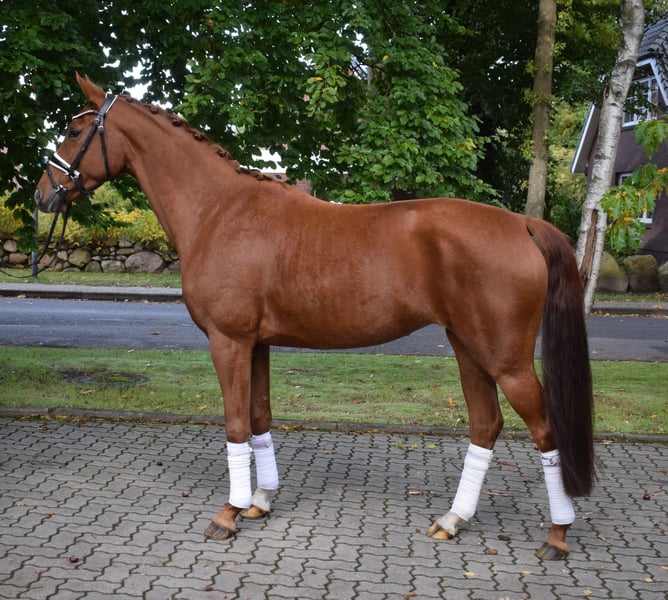 Diese Stute zaubert ihrem Reiter jeden Tag ein Lächeln ins Gesicht! Neben ihrer tollen Rittigkeit verfügt sie über ein aktives Hinterbein und drei sehr gute Grundgangarten. Springtime ist sehr leichtrittig, reagiert gut am Sitz un ist einfach in der Anlehnung zu reiten, durch diese Eigenschaften lässt er jeden Reiter gut aussehen. Sie ist schon gut ausgebildet und auf dem Weg zu Klasse -L-. Der nächste Turniersaison kann kommen! Sie hat einen lieben und aufmerksamen Charakter, ist verträglich in der Herde, dem Menschen gegenüber offen und super freundlich und verschmust, dabei sehr gut erzogen. Dadurch ist sie absolut unkompliziert im Handling, brav beim Schmied etc. Probereiten jederzeit nach Absprache möglich. Mehr Infos finden Sie auf unserer Homepage. Hof Heisterbusch Team.