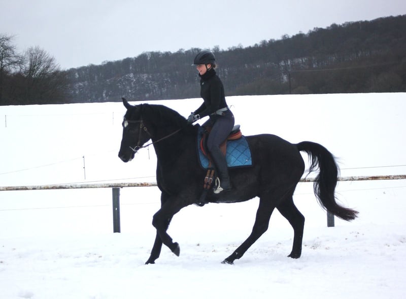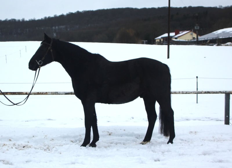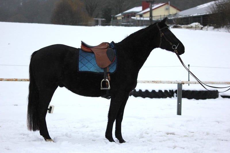 Fürst Frederic, Wallach, *25.05.2018, Faustinus x Rodgau, ca. 166 cm Vierjährig schonend nach den Grundsätzen der Ecole de Légèreté angeritten und seitdem kontinuierlich, aber stets pferdegerecht weiter gefördert. Seit Absetzer in gleicher Hand, kennt also nur faire, ruhige Arbeit und ausreichend Pausen zum Wachsen. Sicher in allen Grundgangarten mit ansprechender Bewegung und bereits ersten Seitengängen unter dem Reiter. Nun auch mit den ersten Sprüngen unterm Sattel, dabei aufmerksam und motiviert, ohne zu überdrehen. Im Gelände in der Gruppe souverän, alleine braucht er noch etwas Übung, zeigt sich aber mutig und lernbereit. Vom Charakter her ein ausgesprochen freundlicher, zugewandter und mutiger Wallach, der die Nähe zum Menschen sucht. Aufgewachsen im Herdenverband, auch in gemischten Gruppen sehr sozial und konfliktfrei. Dauerhafte Boxenhaltung kennt er nicht, akzeptiert zeitweise Boxenruhe aber gelassen. • Verlade- und schmiedefromm • Bisher barhuf mit sehr guten Hufen • Bisher nie krank, insgesamt ein grundsolides Freizeit- und Ausbildungspferd mit Potenzial Neuwertiges Zubehör (Passier-Sattel, Trense, Hufschuhe) kann auf Wunsch miterworben werden, VB zusammen 2.000 €.