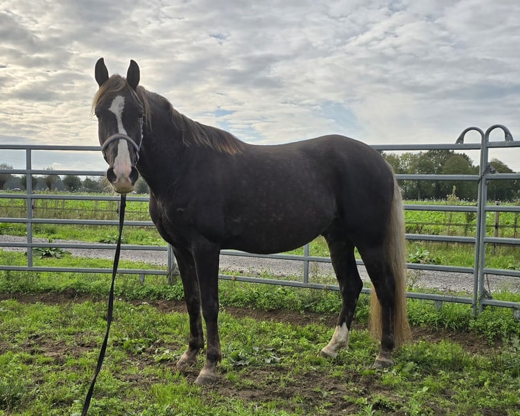 Star’s Silver Heron – Rocky Mountain Horse (RMHA) 7 Jahre alter, großer Rappe mit Silberapfelfarbe Zuchtbuchpapier der Rocky Mountain Horse Association (RMHA) Vater: EFM ROCKIN'ROCKET Farbe: Schwarz Mutter: MVF EASTER PARADE Farbe: Silberapfelschimmel Heron ist ein groß gewachsener, kräftig gebauter Wallach und misst ca. 1,58 m! Sein Charakter ist außergewöhnlich lieb und sanft, menschenbezogen und äußerst treu. Auf der Weide zeigt er alle vier Gänge, im Tölt ist er lateral, mit weiterer Ausbildung besteht viel Potenzial. Sein Vater, EFM Rockin’ Rocket, stammt von der Stute Pretty Woman ab, einer direkten Dock-Tochter, die in Amerika von J. Lee’s Rockit gedeckt wurde. Seine Mutter, MVF Easter Parade, gehört zu den wenigen Pferden in Europa, die die alten Mountain Pleasure Horse-Linien in sich tragen. Easter Parades Mutter, Bourbon Manhattan, ist eine Tochter des Mountain Pleasure Horse-Foundationshengstes Mountain Bourbon sowie der Foundation-Stute Fancy Lady Scarlet. Diese Linien sind in Europa und innerhalb des Rassekreises äußerst selten und sehr nah in der Abstammung verwandt. Heron kennt Bodenarbeit und ist eingeritten. Er hat die Zeit gebraucht, um vollständig heranzuwachsen, weshalb die Ausbildung nun wieder aufgenommen werden sollte. Er arbeitet gern mit und ist sehr lernwillig, er möchte gefallen. Wir suchen für ihn einen Reiter, der mit Gangpferden vertraut ist und ihn weiter ausbilden sowie schöne Ritte machen möchte. Er ist brav beim Hufschmied und wird regelmäßig beschlagen, macht regelmäßig eine jährliche Zahnkontrolle, ist regelmäßig entwurmt, seine Impfungen sind auf dem neuesten Stand, und beim Osteopathen ist er ebenfalls brav. Er kennt das Anhalten, liebt Putzen und Aufmerksamkeit. Er ist leicht auf den Trailer zu laden und läuft stets ordnungsgemäß an der Führleine mit. Heron verträgt keinen Staub, deshalb erhält er bei uns immer Vor-Droog-Hafer oder Heu. Feuchtes Heu kennt er ebenfalls und arbeitet gut damit. Im Frühjahr und Sommer trägt er stets einen Fliegendecke gegen die Insekten. Heron steht bei uns 24/7 draußen auf einer großen Paddock mit großem Unterstand und kommt täglich in die Weide. Das entspricht auch unserer Wunschvorstellung für ihn. Momentan läuft er mit unseren anderen Wallachen und einem Hengst auf der Weide, was problemlos funktioniert. Zuvor hat er auch einige Jahre in einer gemischten Herde mit Stuten verbracht. Der Verkaufspreis für Heron beträgt 12.000 Euro. Möchtest du diesen „großen, intensiven Schatz“, den du immer rufst, wenn er dich sieht oder hört, persönlich kennenlernen oder mehr Informationen erhalten? Dann kontaktiere uns gern über das Kontaktformular oder per E-Mail an jockeylin@planet.nl