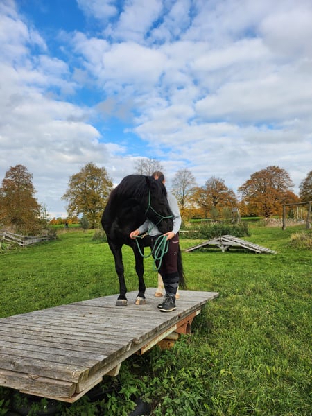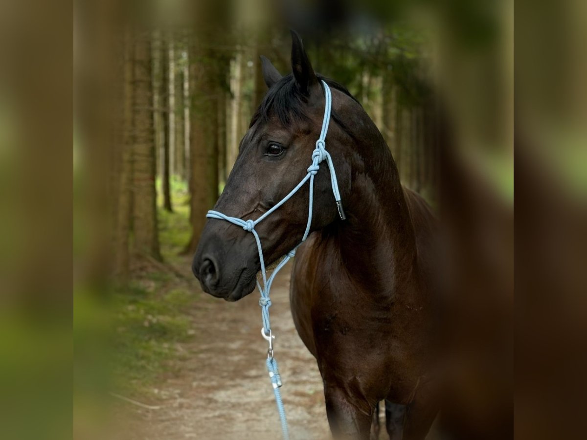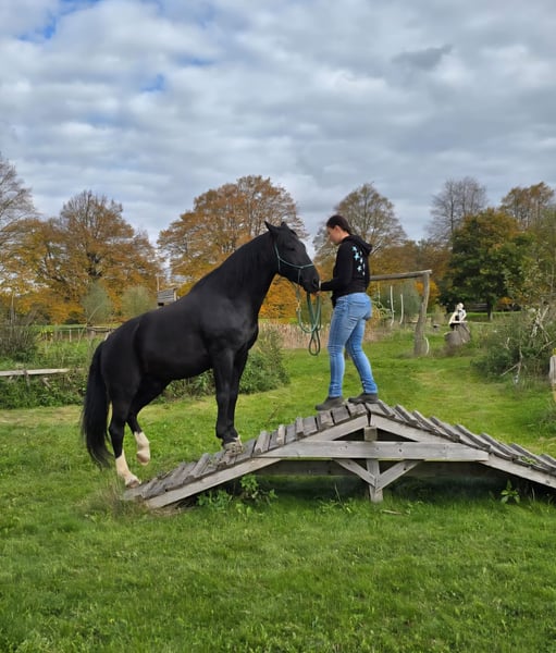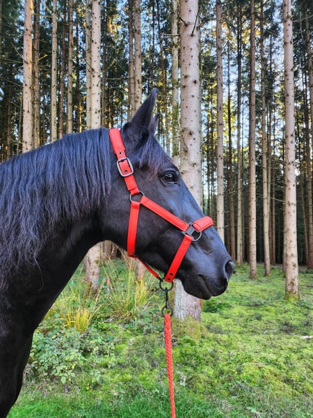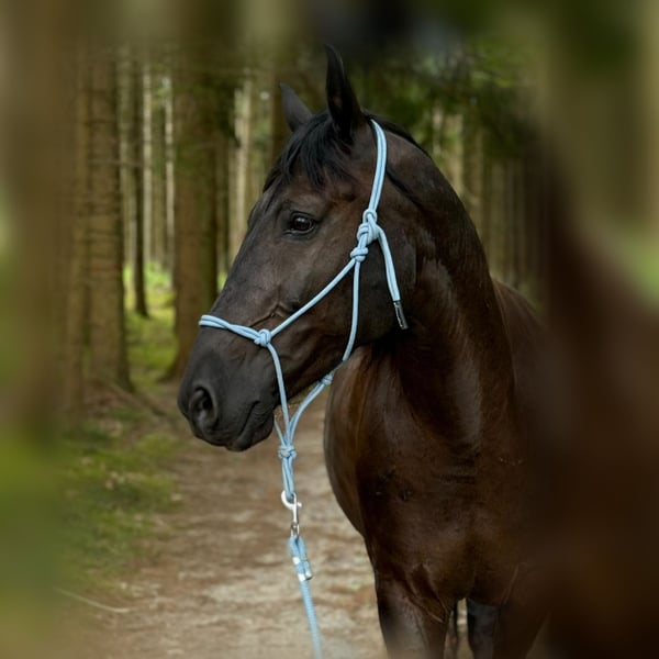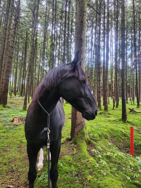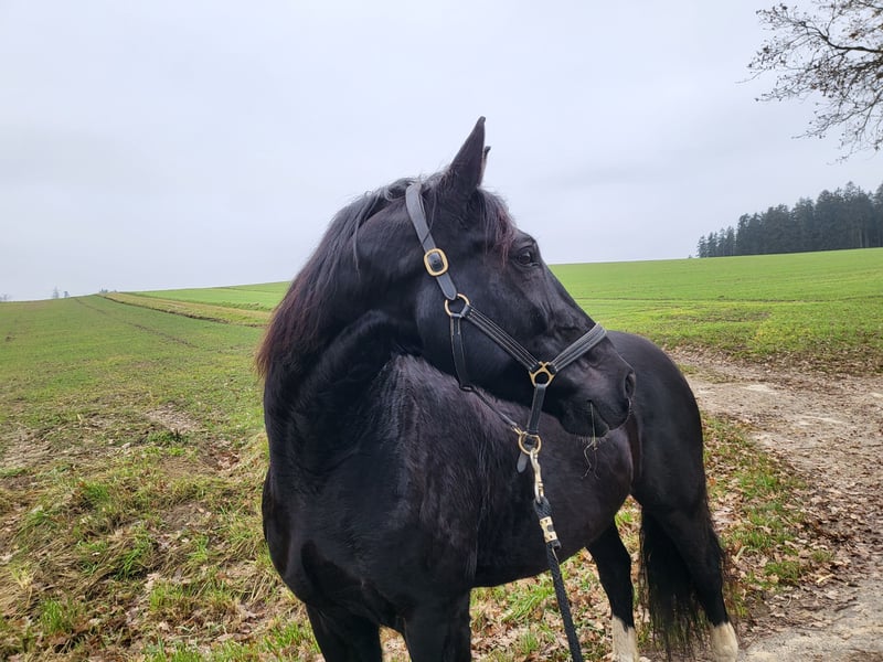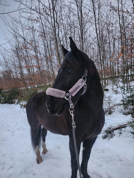 Miro Schleswig-Holstein WB – 16.1 hh – Foaled June 2012 Miro is a sensitive, willing to learn, affectionate, and lovable character horse. We have shared a nearly six-year journey filled with excitement and learning, but now it’s time to part ways. Miro came to us at around 8 years old as a roughly backed, primarily driven carriage horse. What gave us hope from the start that he could become a wonderful riding horse was his human-oriented and open nature. He is now familiar with - Riding in an indoor arena in all three basic gaits, lateral work, travers, shoulder-in (riding according to classical principles, "high" head carriage) - Trail riding alone and in a group - Pulling a sleigh and a harrow - Trailer loading - Trail obstacle courses - Long-distance rides - Leading alongside a bicycle (walk and trot) - Using a mounting block and wippe (can be sold with him) - Jumping up to 50 cm - Walking in hand with a halter He has been ridden, handled, and driven exclusively bitless by me. He responds delicately with minimal aid. Most of all, he "works" best when free with the handler and is allowed to contribute his own ideas. He reacts very well to voice commands and was trained with lots of body language. He is accustomed to receiving positive or "negative" feedback via voice. In my assessment and experience, he is NOT a suitable horse for children. As a barefoot trimmer, I have kept his hooves in functional condition. Currently, his hoof capsule self-trims very well. Slight corrective trims at the back are still necessary; I am happy to provide guidance on this. No signs of laminitis, abscesses, thrush, or similar issues. For longer rides or very stony paths, we have used hoof boots (to be included). He has received osteopathic treatment/support several times a year. His weaknesses include: - His right hind leg has not been properly developed due to prolonged one-sided harnessing (always bent inward from the right side when driving). As a result, he runs "on the hind axle" and may not move perfectly clear, especially in wet and cold weather. Sometimes, he simply "forgets" that leg ;) but this does not affect riding or driving; it just requires some consideration, and you can see his overall (energetic) condition in his leg. - Due to diagonal crookedness, his left front hoof is slightly smaller/narrower. - Being a sensitive type, he does not handle stress well and can become restless (mainly nervous or with mild stomach sensitivity). - Gingival fistulas – only on the lower left canine, requiring semi-annual dental care. He is NOT prone to colic (none in the five years with us) – generally robust constitution. He was only blanketed during persistent rain and temperatures below 10°C. He is not a horse that runs away or bolts. In uncertain situations, he tends to stop and observe as if rooted to the spot. In very challenging situations, such as complete overload, an ill-fitting or overly heavy saddle, or a heavy rider, he may react with bucking. This was an issue initially but has been stable and well-managed for several years. >>> A suitable 18" dressage saddle should be included. Miro is completely socially competent and has always positioned himself in the "middle ground." He is tolerant of socially weaker, bossy mares, and all others who are friendly to him. If someone is unpleasant to him, he tries to avoid that person. He has never bitten or kicked maliciously. He always wants to be "everybody’s darling," both human and animal. He absolutely does NOT buck or rear! He has always been housed during the day in a mixed herd and at night in a box. I could also imagine him thriving in a paddock with a small herd. I do NOT sell him solely to a box or individual turnout with only occasional pasture turnout! I am looking for someone who will continue to let him demonstrate his skills in free work, be patient when he feels unsure, promote him with kindness rather than forcing him into a certain form, and accept a "no" when necessary. He will give his best. Since my "action/power program" has caused him long-term stress, I am seeking a calm, adventure-free new owner for him. Routine and familiarity are very important to him! Despite his sturdy build, the rider should not weigh more than 75-80 kg. His health and medical history since birth are transparent and well-documented. Priority over price for this wonderful all-rounder :) Ideally, my mother and I would like to visit his new home and maintain a friendly contact to support with any questions – if desired. Preference for placement within Bavaria. Absolutely no emergency sale! Please call only after 5:00 PM on weekdays: 01515 9207098 Jasmin Findorff