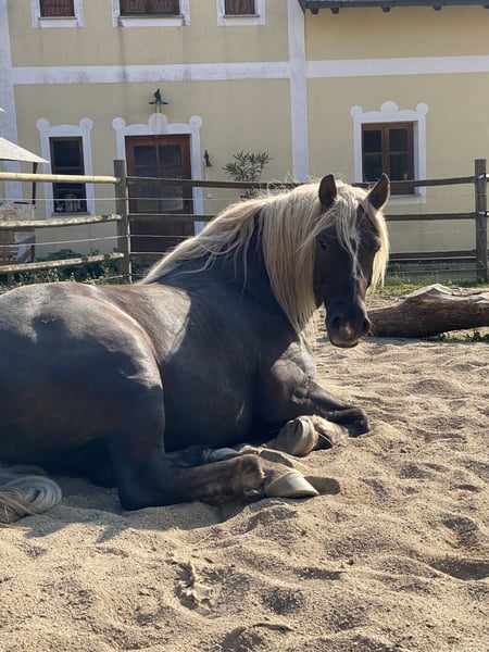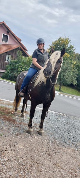For sale is a handsome dark chestnut gelding, born in April 2016. He was awarded a gold medal as a foal. With an approximate height of 1.60 meters (16.1 hh), he is ideally suited for leisure riders. He is a friendly and reliable companion. Falko has basic Western riding training but has been ridden only occasionally lately due to my limited time. He enjoys hacking out, usually alone, which is no problem for him. He impresses with his friendly nature and willingness to learn new things. The gelding is healthy and barefoot. He is suitable for both experienced riders and beginners looking for a dependable partner. He is a very sweet, people-oriented horse, completely fearless, and does not bolt when startled. Due to his strength, he is also suitable for somewhat heavier riders. This is not a desperate sale – he will only be placed in the best hands and in a pasture-based stable. If interested or for further information, I am happy to assist. Viewings and trial rides are possible by arrangement.