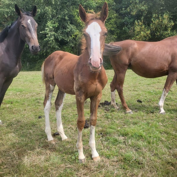 Top pedigree pour ce très beau foal : Père : Kilimandjaro Semilly (Acton Breaker x Baloubet du Rouet) Mère : Vidaline ISO 130 (Quartz du Chanu (L'Arc de Triomphe x Papillon Rouge) x Chenu du Plessis) Penjab d'Herloïne se distingue par son modèle harmonieux, de belles allures et du chic avec ses grandes chaussettes, une belle liste et une tache originale sur le ventre Il est d'un caractère curieux. Il est manipulé depuis la naissance et habitué aux soins courants. ➡️ Foal visible dans le Calvados ➡️ Partira sevré, pucé, vacciné et avec papiers 📌 Convient pour le sport (solides origines CSO) 💶 Prix : 7 000 € ( pas de TVA) 📞 Plus d’informations et photos/vidéos sur demande