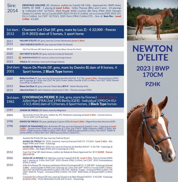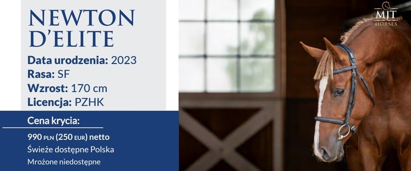 OFERTA STANÓWKI 2026. Posiadamy w naszej ofercie w tym sezonie niesamowicie utalentowane młode ogiery z wybitnych linii żeńskich dające konie GP160. Newton D’Elite. - (Ermitage Kalone x Chamane Cot Chat / Lux Z) - Talent, piękno, dużo krwi. Syn Ermitage Kalone. Newton D’Elite to obiecujący ogier z rodowodem łączącym wybitne osiągnięcia w skokach przez przeszkody oraz doskonałe cechy hodowlane. Udowodnił już swoją wartość na Normandy Horse Show zostając wybranym jako najlepszy dwuletni ogier. Tam też został on wyselekcjonowany i zakupiony przez MJT Horses. Jego ojciec, Ermitage Kalone, to ogier o imponującej karierze sportowej i hodowlanej. Pod wodzą belgijskiego jeźdźca Gilles’a Thomasa, Ermitage Kalone zdobył złoty medal drużynowy oraz brązowy medal indywidualny na Mistrzostwach Europy w A Coruña w 2025 roku, prezentując pięć perfekcyjnych przejazdów. W 2024 roku brał udział w Igrzyskach Olimpijskich w Paryżu, kwalifikując się do finału z czystym przejazdem Jego ojciec, Catoki, to ogier o imponującej karierze sportowej i hodowlanej. W 2010 roku zajął 2. miejsce w konkursie Pucharu Świata w Bordeaux (CSI5*-W), 1. miejsce w Grand Prix w Vigo (CSI5*-W), 2. miejsce w konkursie Pucharu Świata w Helsinkach (CSI5*-). W 2011 roku zajął 1. miejsce w konkursie Pucharu Świata w Bordeaux (CSI5*-W). Catoki to syn ogiera Cambridge, który był wicemistrzem Niemiec w 1993 roku. Matka, Bilda, pochodzi z linii po ogierze Silvester, który był jednym z najważniejszych ogierów skokowych swojej generacji. Matka Ermitage Kalone, Bellaventure Kalone, to klacz o doskonałym rodowodzie i osiągnięciach sportowych. Jej ojciec, Kannan, to ogier o imponującej karierze sportowej i hodowlanej. Kannan, syn ogiera Voltaire, zdobył liczne tytuły w międzynarodowych zawodach skokowych, w tym Grand Prix w Aachen i Rotterdamie. Jego potomstwo, w tym Bellaventure Kalone, dziedziczy po nim doskonałe cechy skokowe. Chamane Cot Chat to córka ogiera Lux Z, który pod Jerrym Smitem w 2000 roku brał udział w Igrzyskach Olimpijskich w Sydney. W tym samym roku zwyciężył w zawodach Pulsar Crown w Cannes. Jej matka Nacre De Presle to córka ogiera Damiro, który zaliczył liczne starty na arenie międzynarodowej poziomu 160 cm. Ten zaś pochodzi od wybitnego skoczka jakim jest Ramiro Z. Od strony matki Damiro możemy znaleźć znakomitego Alme, który nie tylko zasłynął na arenie międzynarodowej ale również jest ojcem wielu koni olimpijskich i zwycięzców grand prix. Rodowód Newtona D’Elite łączy w sobie najlepsze cechy swoich przodków: technikę, moc, szybkość reakcji oraz doskonały charakter sportowy. Jego potomstwo można spodziewać się obdarzone doskonałym zakresem, poprawną techniką i stabilnym temperamentem, gotowym do pracy na najwyższym poziomie. Cena nasienia to jedyne 990 zł netto + 8% VAT. Jest to cena uprawniająca do krycia jednej klaczy przez sezon hodowlany 2026. Do ceny nasienia należy doliczyć koszty dokumentacji 300 zł netto + 23% VAT , oraz koszt wysyłki. Możliwość opisania źrebięcia w PZHK. Wszystkie materiały potrzebne do podjęcia właściwej decyzji znajdziecie państwo poniżej. +48 885 563 658 Maciej www.mjthorses.com KATALOG https://mjthorses.com/_Resources/Persistent/6/f/5/8/6f58f201ad940192b173390324b1276ad64982cc/M_nowe_2026_PL_katalog.pdf YOUTUBE SKOKI OGIERÓW https://youtube.com/playlist?list=PLqJoGiloQ5UgR_JRg-dZT-zvRRoS74V1i&si=FCYWtkgN7Pt6tWva INSTAGRAM https://www.instagram.com/mjt_horses?igsh=ZTZ3OWRva2FtbHY0&utm_source=qr FACEBOOK https://www.facebook.com/share/1BtNmhwzT1/?mibextid=wwXIfr ZAPRASZAMY DO KONTAKTU!