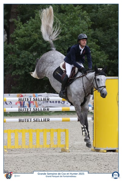 JOYEUSE DU TERTRE is een prachtige grijze sportmerrie, geboren en opgevoed op de fokkerij du Tertre in Bretagne, in een gezonde en evenwichtige omgeving. Ze is op driejarige leeftijd zadelmak gemaakt en begon op vierjarige leeftijd met wedstrijden. - 6 foutloze rondes op 4-jarige leeftijd - 11 foutloze rondes op 5-jarige leeftijd - 13 foutloze rondes van de 16 op 6-jarige leeftijd, met een uitstekende vermelding en eindigde op de 14e plaats van het Franse kampioenschap. JOYEUSE DU TERTRE is een schattige merrie en zeer gemakkelijk, met een zeer goede balans en vele sterke punten. Ze heeft ook een uitstekende springtechniek - ze is perfect opgeleid en bereidwillig. Ze komt uit een goede moederlijn, aangezien haar moeder kampioen van Frankrijk is voor 7-jarige merries in 2018 en competitief is in proeven van 150. Een uitstekende moederlijn van goede winnende paarden op nationaal en internationaal niveau, waardoor ze een zeer goede fokmerrie kan worden aan het einde van haar sportcarrière. JOYEUSE DU TERTRE zou perfect passen bij een amateur- of professionele ruiter die haar kan laten evolueren en springen in proeven van 140 en hoger. Perfecte gezondheid: veterinaire keuring en röntgenfoto's OK.