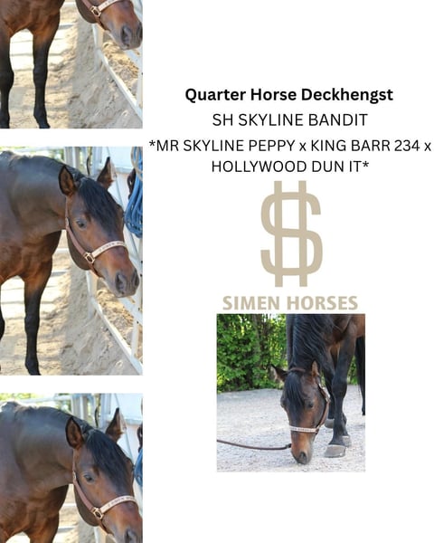SH SKYLINE BANDIET Zeer chique en goed gefokte Quarter Horse hengst uit eigen fokkerij. Rustig karakter en braaf in de omgang. Helder hoofd. Stkm. momenteel 150cm. Papier bijgevoegd. Heeft al enkele nakomelingen, die worden opgeleid als solide recreatiepaarden, maar ook als wedstrijdpaarden. Covers in natuurlijk springen. 5 Paneel N/N. Geregistreerd in Duitsland en de VS. Kweekvoorwaarden op aanvraag!
