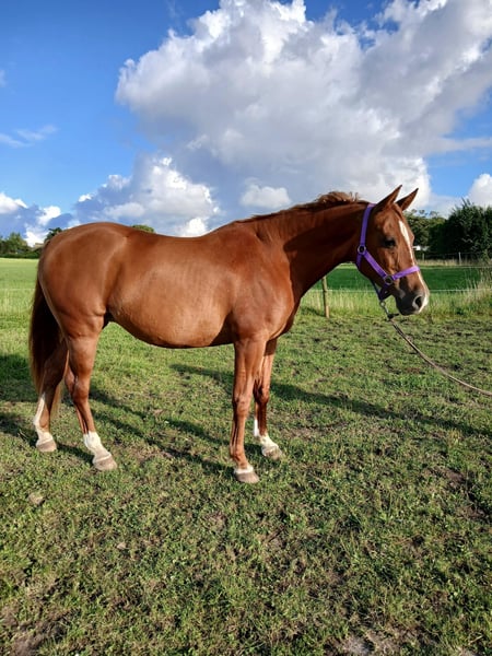 Daria est une jument très sensible qui ne sera confiée qu'à des mains très expérimentées et de la meilleure qualité. Elle a été montée pour la première fois à l'âge de 5 ans, mais n'a pas été poursuivie en raison de mes difficultés de temps. Elle a eu un poulain femelle il y a 2 ans et est enregistrée comme jument primée au VZAP. Malheureusement, elle n'est pas redevenue pleine depuis. Elle a besoin d'une personne en qui elle peut avoir confiance. C'est une jument très amicale et prudente, qui est très attachée et aime l'affection.