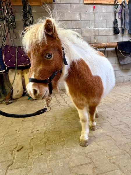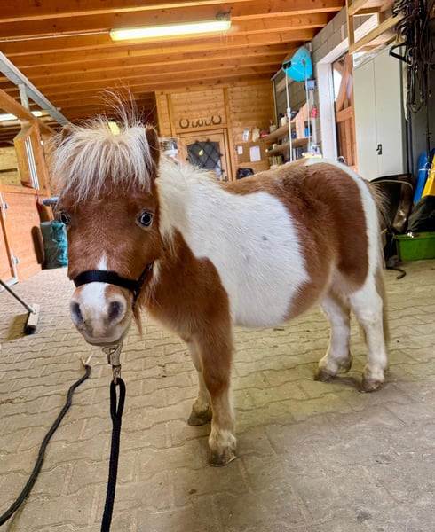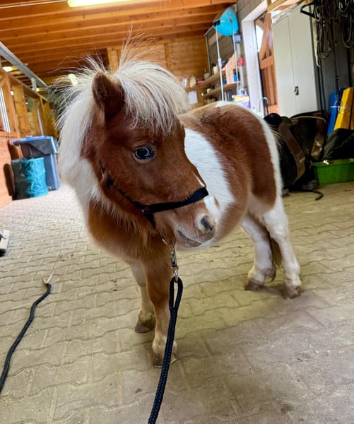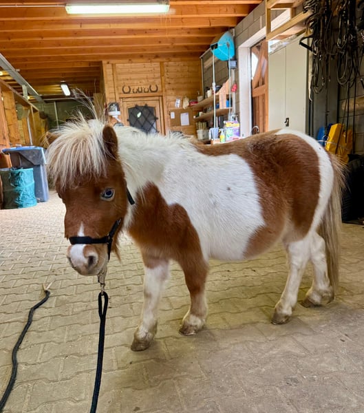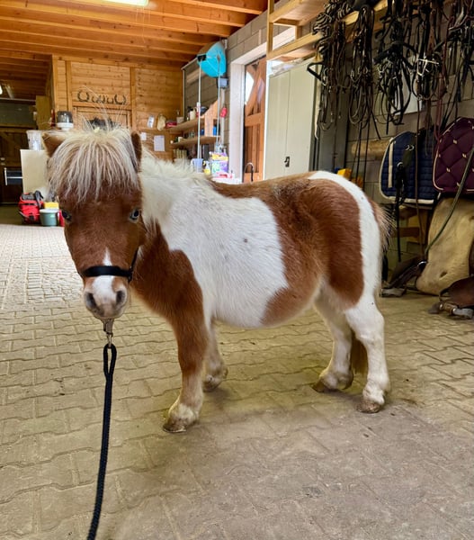 For sale is a 2-year-old Shetland stallion born in spring, with a striking appearance and no known pedigree. He is currently approximately 32 inches (81 cm) tall. He has beautiful blue eyes and a lovely splash coat. He lives in a herd with another stallion and is also compatible with geldings. He is well-behaved during grooming, hoof care, and when tied up. He is halter-trained and calm in handling. He would surely make a wonderful children's pony. Two additional splash coat stallions are also available for sale. No known illnesses or allergies. An AKU (health examination) can be performed upon request. Please feel free to call or send a message to 0157 36803742. All information is provided without guarantee; prices are subject to change. Transport possible; online purchase available.