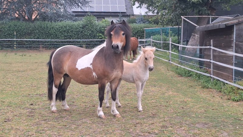 Schweren Herzens wegen Aufgabe der Ponyhaltung suchen wir für unsere besondere Stute ein passendes Zuhause. Zum Verkauf steht eine original Shetlandpony Stute, 5-jährig, Braunschecke. Sie ist eine Staatsprämienstute und wurde beim Stutenchampionat als beste Typstute ausgezeichnet. Im letzten Jahr hatte sie ein Fohlen, das ebenfalls zum Championat eingeladen war – sie bringt also beste Voraussetzungen für die Zucht mit. Aktuell ist sie noch nicht gearbeitet, kennt jedoch Bodenarbeit und kleine Tricks und zeigt sich dabei lernwillig und aufmerksam. Charakterlich ist sie ein ganz besonderes Pony: unerschrocken und sehr cool geht problemlos alleine von der Herde weg gleichzeitig aber auch eigenständig – wenn sie etwas nicht möchte, zeigt sie das klar. 👉 Daher ist sie nur bedingt für Kinder geeignet und kein Anfängerpony. Wir wünschen uns für sie ein Zuhause bei pferdeerfahrenen Menschen, die ihren Charakter zu schätzen wissen und entsprechend mit ihr arbeiten. Optimal wäre ein Einsatz als Zuchtstute oder Fahrpony, wo sie ihr Potenzial entfalten kann. Uns ist es extrem wichtig, dass sie in die richtigen Hände kommt – Platz vor Preis.