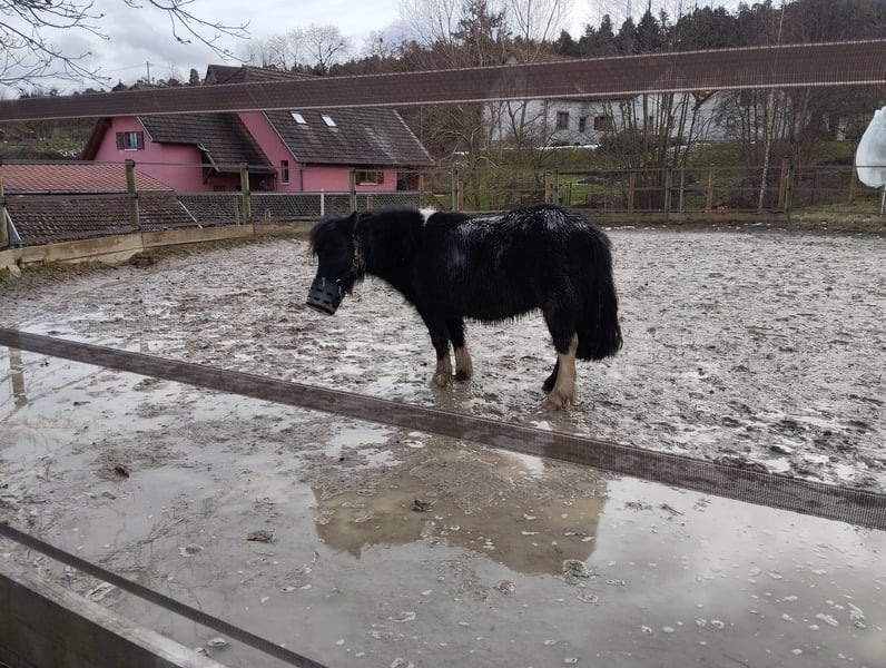 Pony with full papers, Shetland registered in the breed studbook as a breeding mare. Purebred Shetland lineage - Book A. Calm. Can stay alone in all circumstances. Thoughtful. Very connected to humans, seeking contact. Easy to catch in the pasture. Pleasant to live with. Even-tempered. Sociable. Gets along with all equines, as well as dogs, chickens, cows, and sheep. All options are open for her: breeding project or competition sport. Ideal as a breeding cornerstone or a child's first pony. Has never been in a riding club. She has already carried a child on her back without concern. Gave birth for the first time in 2024 - foaling alone without any issues. Calm foal, with a lot of bone like her, sold as a stallion prospect. Educates her foal and connects it with others and humans. Easy foal. Not re-bred, sold empty as a broodmare. Rare product on the market. Her sire is the international class 1 stallion TEXAS DU LUTZELHOF (last photo - bay tobiano).