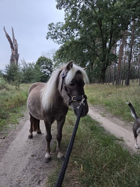4-jähriger Dt. Partbred Shetty Wallach, Windfalbe, 82 cm Beschreibung: Schweren Herzens müssen wir uns auch von unserem kleinen Partbred Shetlandpony Desperado (Milky), trennen, da wir die private Pferdehaltung komplett aufgeben. Auch ihm wünschen wir ein wunderbares neues Zuhause, denn wir geben unsere private Pferdehaltung aus persönlichen Gründen vollständig auf. Milky haben wir am 14.09.2024 direkt vom Züchter als Hengst gekauft, um unsere kleine Herde zu erweitern. Kurz danach haben wir ihn legen lassen. Er ist ein junges, neugieriges und sehr liebenswertes Pony, das uns schnell ans Herz gewachsen ist. Über Milky: Geboren: 08.05.2021 (4 Jahre) Stockmaß: ca. 82 cm Rasse: Deutsches Partbred Shetlandpony (Dt. Pb ShP) Farbe: Windfalbe Geschlecht: Wallach Charakter & Alltag: Milky ist ein sehr liebes und menschenbezogenes Pony, sobald er Vertrauen gefasst hat. Er beobachtet aufmerksam, lernt schnell und entwickelt eine enge Bindung zu seiner Bezugsperson. Wir sind oft mit ihm alleine im Gelände spazieren gewesen, was er zuverlässig und ohne große Aufregung meistert. Er möchte seinem Menschen gefallen und ist draußen sehr brav. Zwei Dinge, die er aktuell noch übt: Beim Aufhalftern braucht er etwas Geduld und Vertrauen Decken mag er momentan noch nicht Mit liebevoller, klarer Anleitung lässt sich das aber gut weitertrainieren. Gesundheit & Pflege: Regelmäßige Impfungen (nächste Influenza Impfung: Januar 2026 / nächste Tetanus Impfung: April 2026) Entwurmung alle drei Monate (zuletzt am 30.11.2025) Haltung bei uns: Offenstall mit Sandpaddock und 24/7 Heu Er ist kerngesund und geht problemlos auf den Anhänger! Besonderheiten / Wünsche: Wir wünschen uns für Milky ein liebevolles Zuhause, in dem er weiterhin viel Aufmerksamkeit und Geduld bekommt. Kein Verkauf an Händler! Schön wäre es, wenn wir ihn – wie unsere anderen Pferde – gelegentlich besuchen dürfen! Bei Interesse freuen wir uns über eine kurze Vorstellung, gerne auch über WhatsApp: 015224402128.