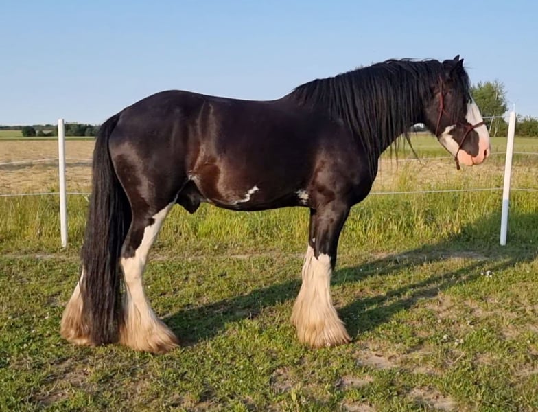 Rozdziera mi serce, ale z powodów zdrowotnych muszę rozstać się z moim ukochanym, prawie 8-letnim ogierem rasy Shire Horse. Posiadam aktualne badanie kwalifikacyjne wraz z rentgenami nóg i kręgosłupa oraz wyniki badania krwi. Ten przytulny gigant w rozmiarze XXL ma dokumenty SHS, jest niezwykle łagodny i bardzo czuły. Żyje w stadzie klaczy i absolutnie nie wykazuje zachowań hengistycznych (już był trzymany w otwartej boksie pomiędzy ogierem a wałachem)! Jak na rasę Shire przystało, jest zupełnie nieustraszony (np. stoi obok podczas cięcia drewna z piłą spalinową i z zaciekawieniem obserwuje :-) ). Już wielokrotnie skutecznie krył i wydał na świat piękne źrebięta w kolorze czarnym i czarnobrązowym, które wyróżniają się bardzo przyjaznym i pewnym charakterem. Sam jako źrebię (w Anglii) był wielokrotnie nagradzany. Został sprowadzony z Anglii jako dwuletni koń. Ponieważ zgodnie z rasą odpowiednio się nim opiekowałam, nie zaczynałam go zbyt wcześnie od siodła (wciąż rośnie), więc został wsiadany dopiero pod koniec poprzedniego sezonu wiosennego (metoda horsemanship) i radzi sobie świetnie! To prawdziwy "kanapa" w każdej chodzie i zachowuje spokój nawet w ruchu ulicznym. Nie jest klejem i potrafi jeździć samodzielnie lub zostawać na pastwisku samodzielnie. Dobrze wyobrażam sobie, że świetnie nadawałby się do zaprzegu, ponieważ ma nerwy jak drut. Za zwrot kosztów mogę go również wyszkolić do zaprzegu. Sprzedaję go tylko w najlepsze ręce! Rozumiem, że nie każdy dysponuje przyczepą lub transportem dla koni, dlatego można go również dowieźć. Na życzenie chętnie prześlę więcej zdjęć lub filmów.