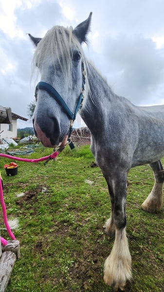 Beautiful Shire Horse Mare for Sale For sale is an impressive Shire Horse mare, born in 2021. This elegant grey mare stands approximately 180 cm tall and is known for her friendly, calm demeanor. She is well-suited for leisure riding and is suitable for both experienced riders and beginners. Features: - Breed: Shire Horse - Gender: Mare - Year of Birth: 2021 - Color: Grey (dappled) - Height: approx. 180 cm - Intended use: Leisure The mare is healthy, regularly vaccinated, and well cared for. She has a balanced temperament and is easy to handle. An ideal choice for anyone seeking a reliable and majestic leisure horse. Please feel free to contact me for more information or to arrange a viewing and trial ride.