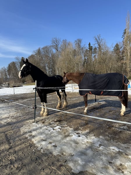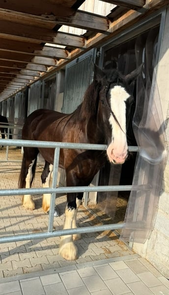 If everything fits, I am willing to give up my 6-year-old Shire mare. This is not a distressed sale; she will only be handed over to the best possible home. Cinderella was purchased directly from the breeder in North Rhine-Westphalia at the age of three. I personally met her there and picked her up. She needed to learn quite a bit back then, but she is now well-behaved in all common situations. Cinderella is barefoot and has never worn shoes; she is well-behaved at the blacksmith. She is regularly vaccinated and dewormed. However, she has a minor health issue: she sustained a head wound in a paddock accident, and there is a suspicion of ataxia. In daily life, I haven't noticed anything unusual—she doesn't trip noticeably or show any signs of falling or losing balance. She finds trailer loading quite difficult but is generally good at being loaded. During transport, she tends to lean back on the tailgate and has to exert herself to keep her balance. Under saddle, she has only been ridden at the canter in the field so far. Indoors or on the riding arena, she can only manage it with ground assistance, but with some training, this could probably be improved. She was trained very gently and gradually. The suspicion of ataxia should always be kept in mind, and special attention should be paid to any signs of discomfort or pain. I ride her both alone and in groups. She is familiar with the riding arena and indoor school, lunging, groundwork, double lunge, grooming, washing, drying, and shearing—everything that belongs to proper care ☺️. A dressage saddle in her size and other high-quality equipment will be included. She is housed in a large XXL box with daily turnout but is also used to paddock life. She is not suitable for beginners, as she can become easily unsettled in unfamiliar situations or environments and may try to escape. Once you know what to look for, this can be managed, but it requires experience. She will not be sold abroad (only within Germany or Austria), nor to riding schools, as a companion horse only, or solely for breeding purposes. She needs to be kept busy and loved. A few visits for getting to know her are highly recommended. Absolutely priority is given to the home, not the price.